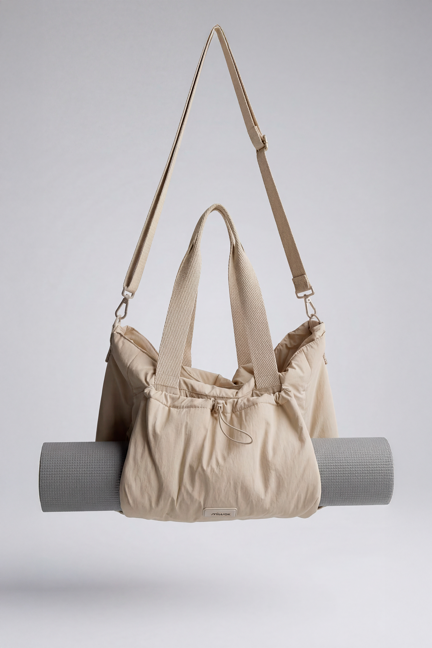 Bolso técnico diseñado para acompañar la práctica de yoga y el movimiento diario. Con bolsillos funcionales y espacio específico para transportar el mat, combina organización, ligereza y resistencia, reflejando el equilibrio entre funcionalidad y estilo activo.