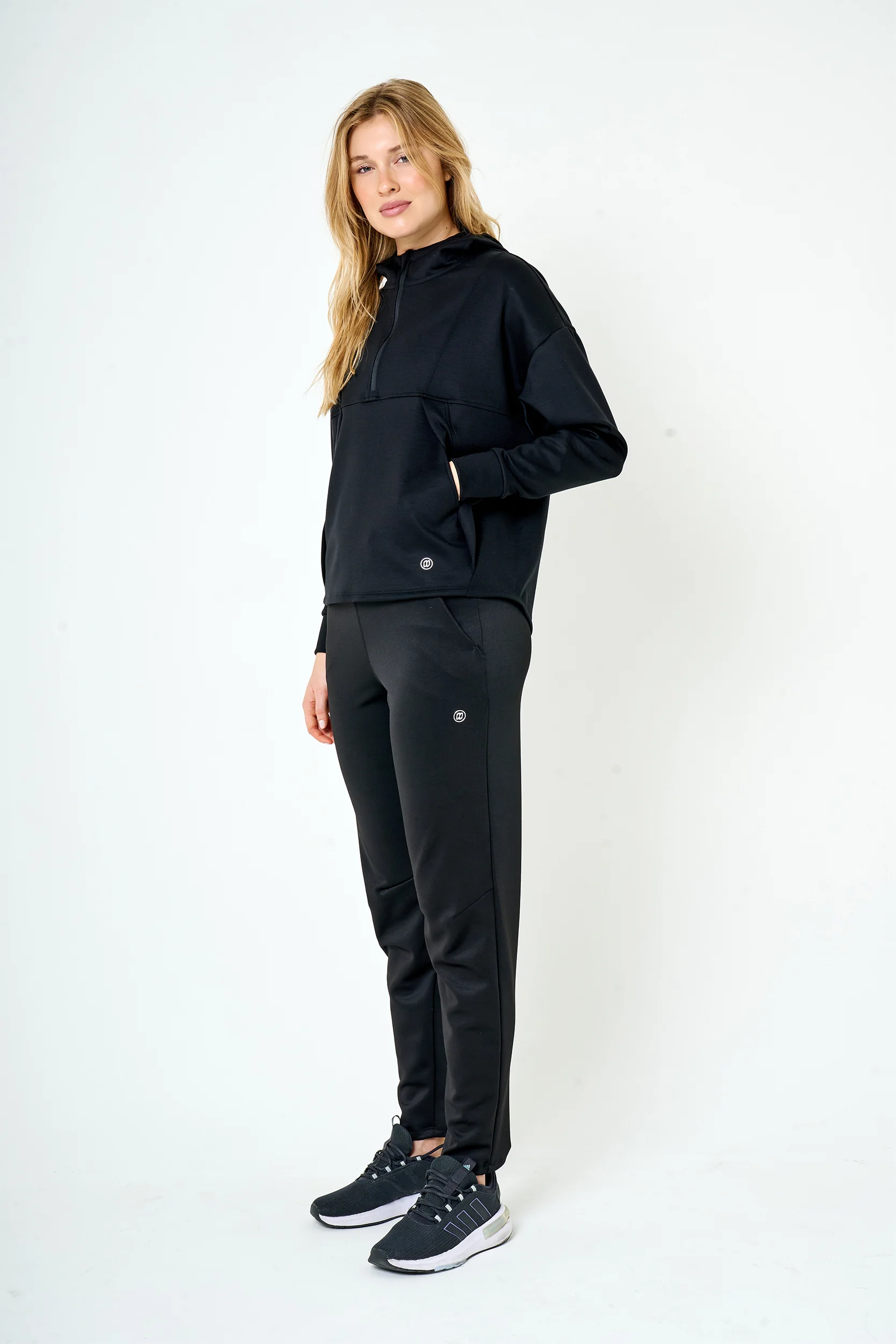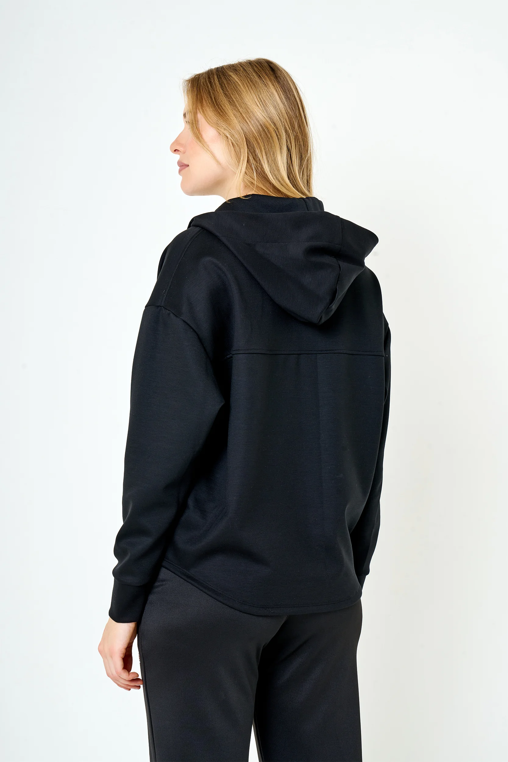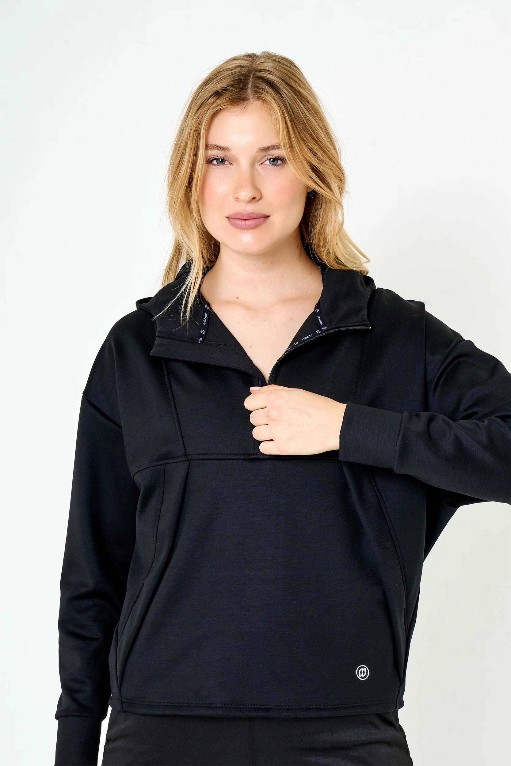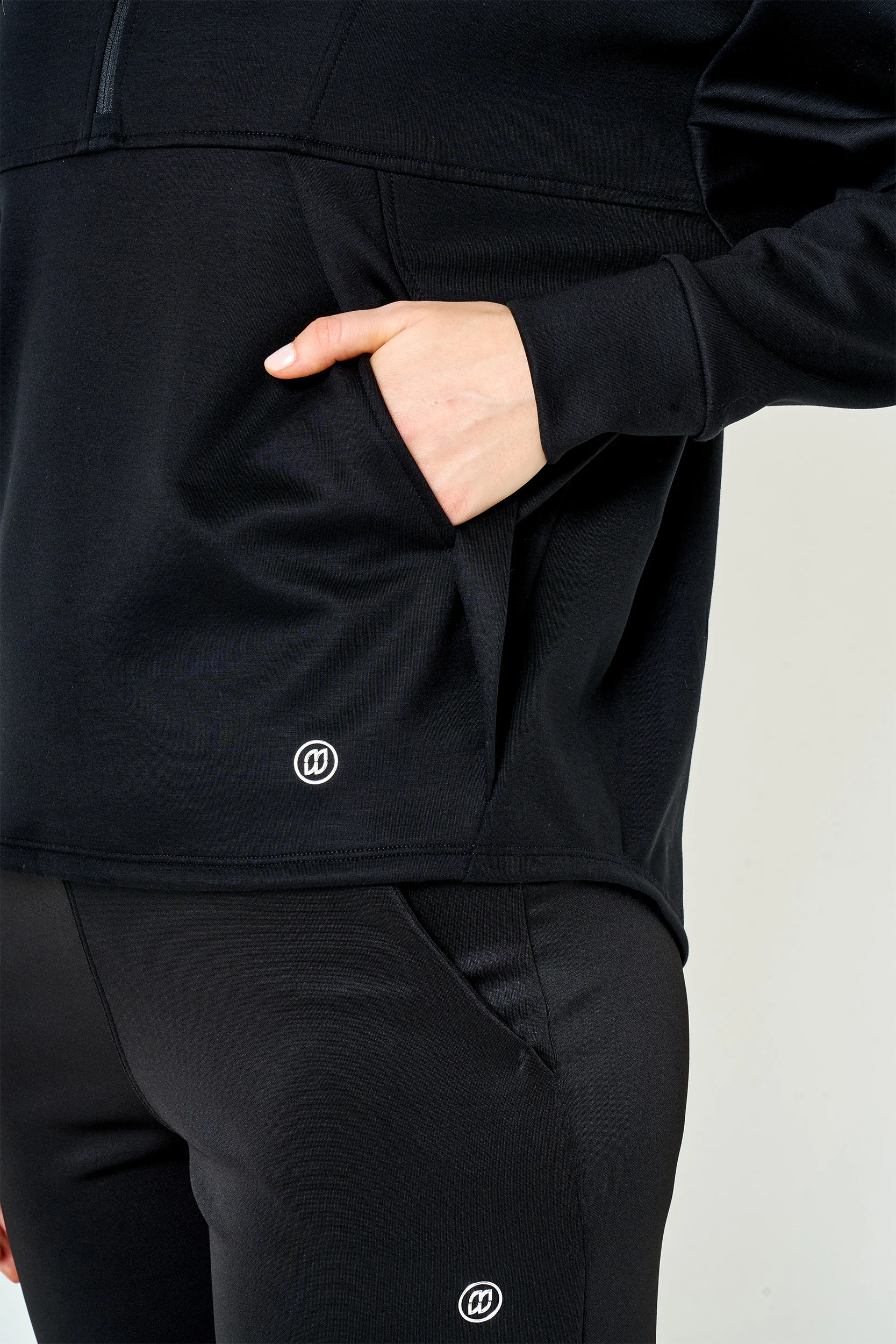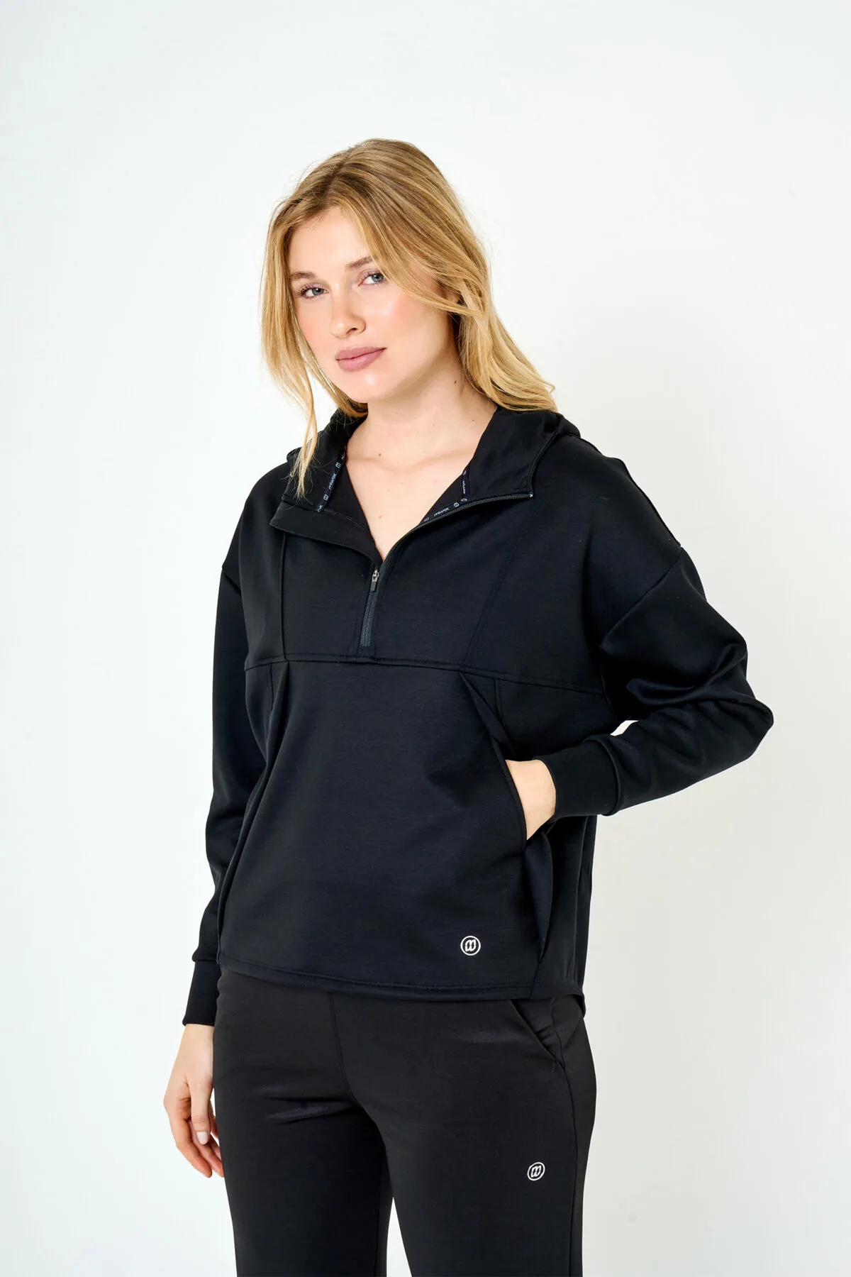 Buzo de medio cierre y capucha forrada, confeccionado en tejido premium con alto contenido de liocel, una fibra sostenible y biodegradable reconocida por su suavidad excepcional, transpirabilidad y resistencia natural. El material ofrece elasticidad ligera y caída fluida, brindando confort y frescura durante todo el día. Con bolsillo canguro y cierre con vista, esta prenda combina funcionalidad, diseño urbano y la calidad distintiva de un textil premium.
