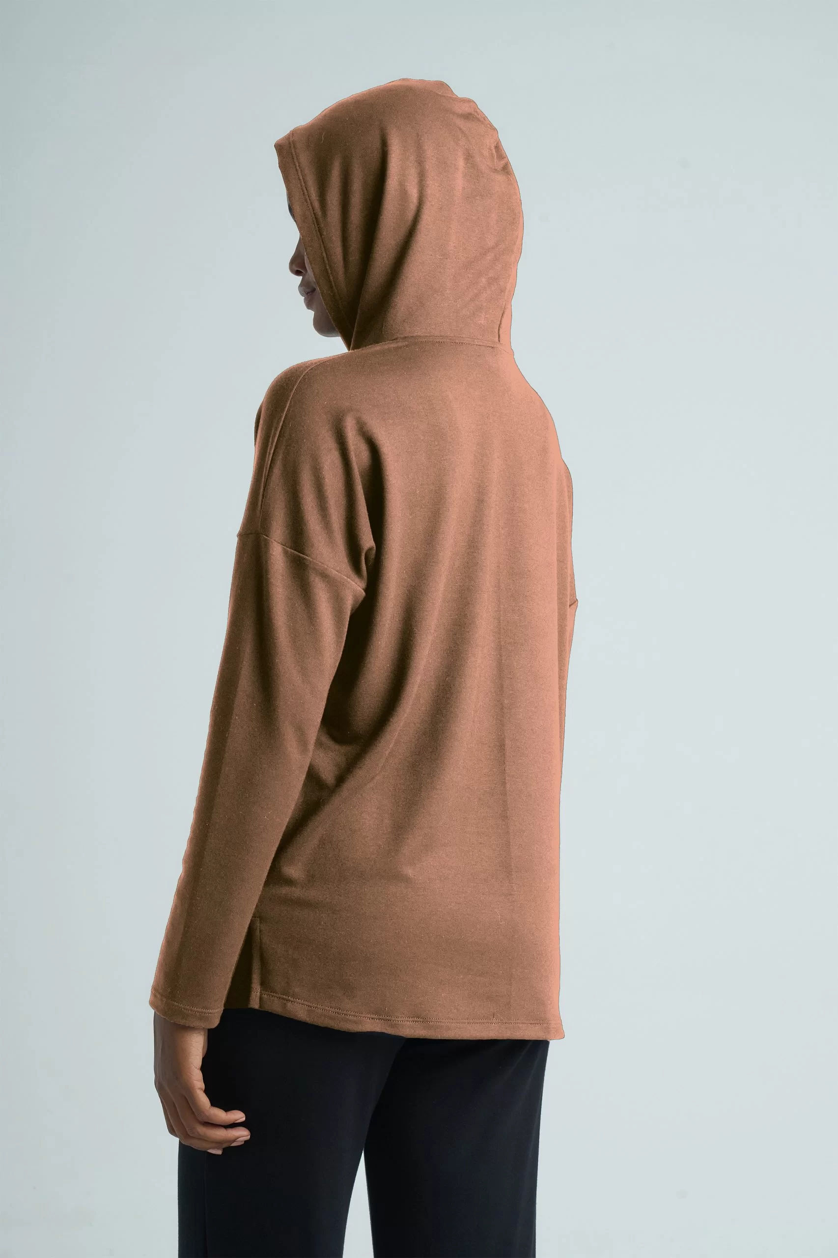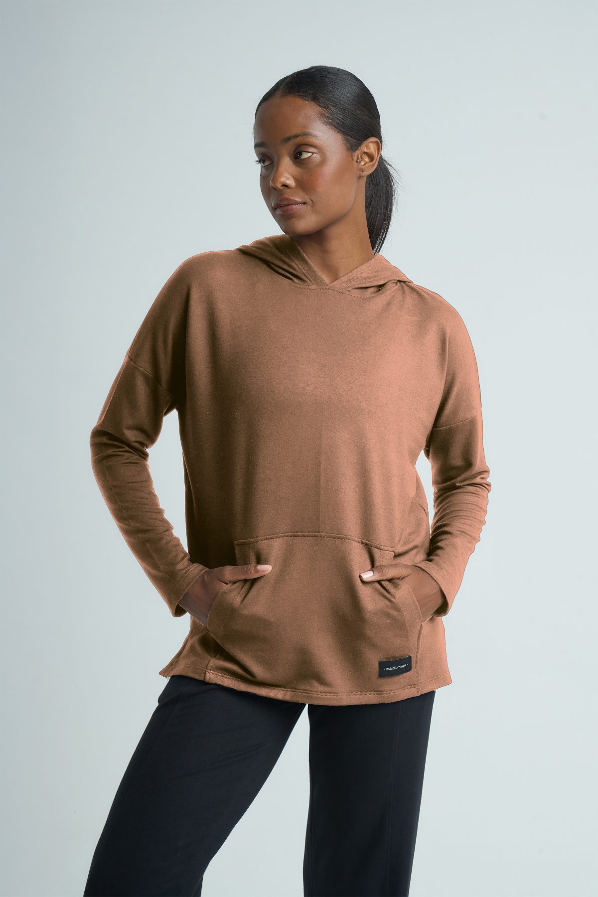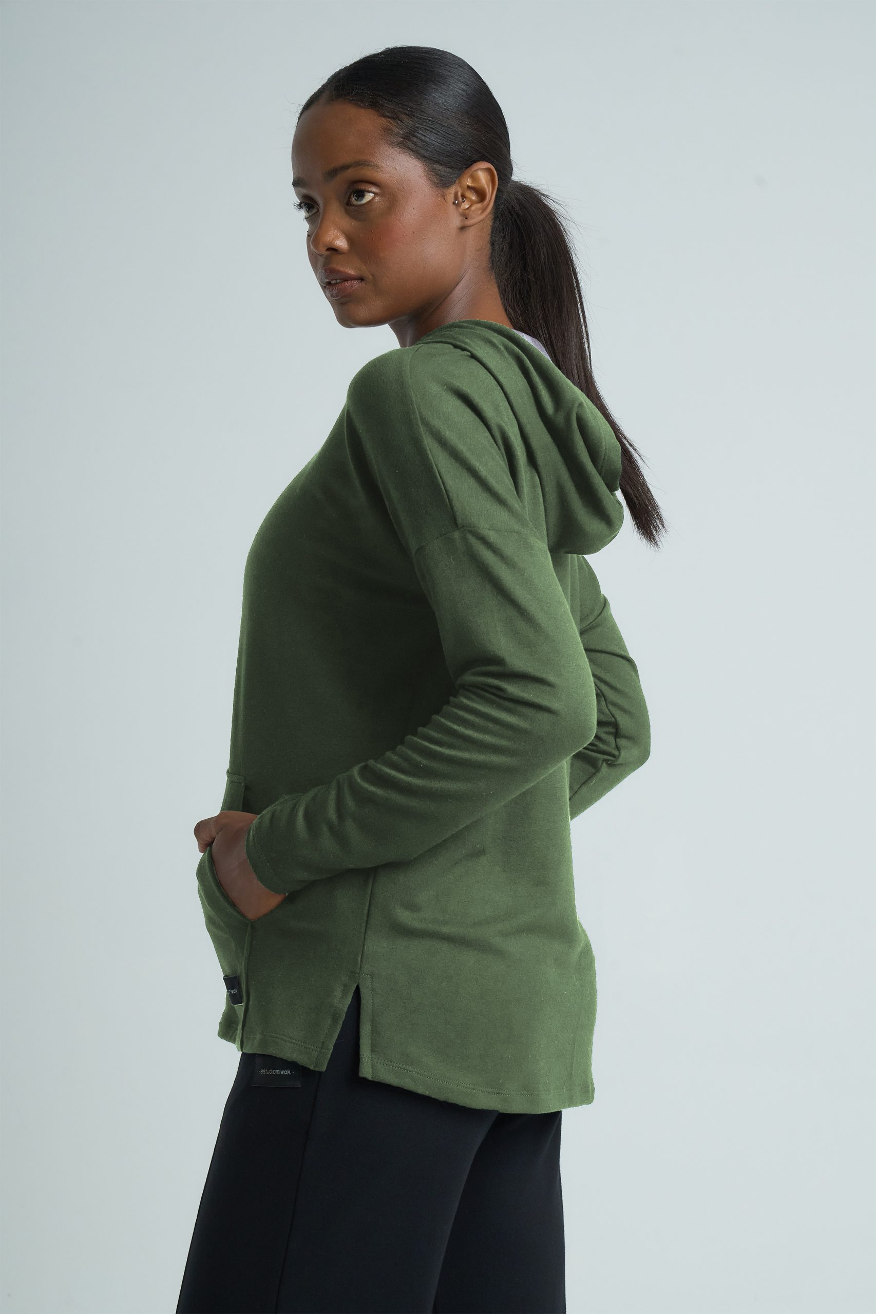 Buzo de tacto extra suave y liviano, con bolsillo canguro y tajos laterales, confeccionado en rústico viscosa elastizado para acompañar todos tus días ofreciendo la máxima comodidad y versatilidad. Presenta una capucha forrada para sumar al confort en cada uso.