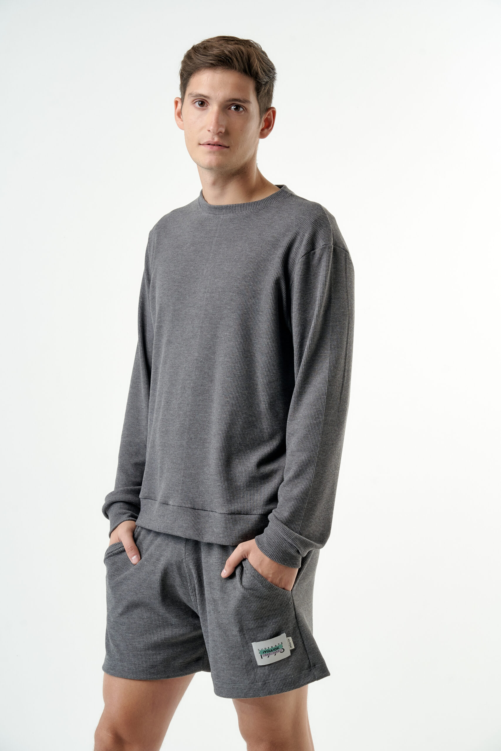 Buzo clásico escote redondo con detalle de etiquetas en espalda. Textil con caída de tacto soft y textura diferenciada. Diseño liviano para brindar mayor libertad de movimiento en el día a día.