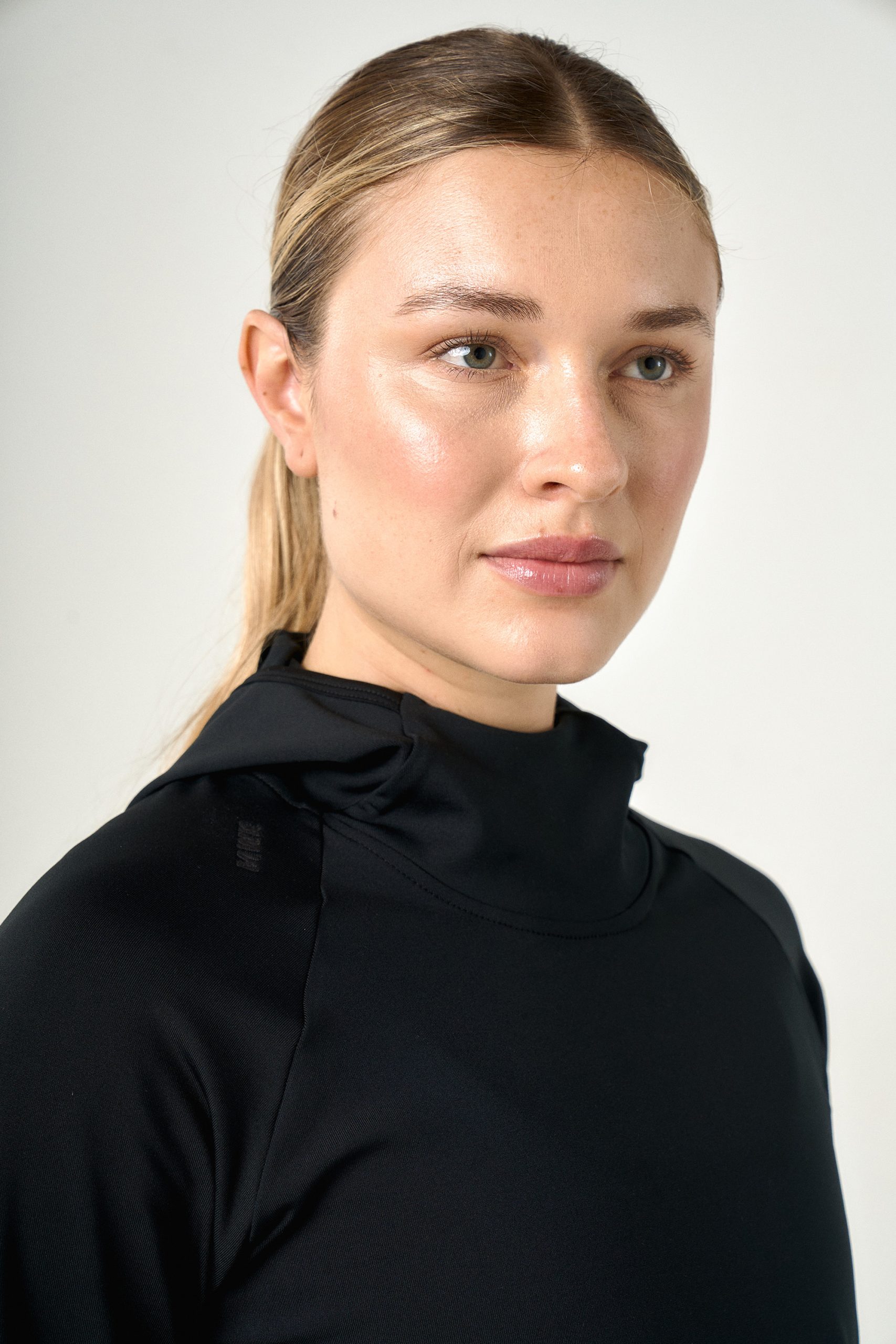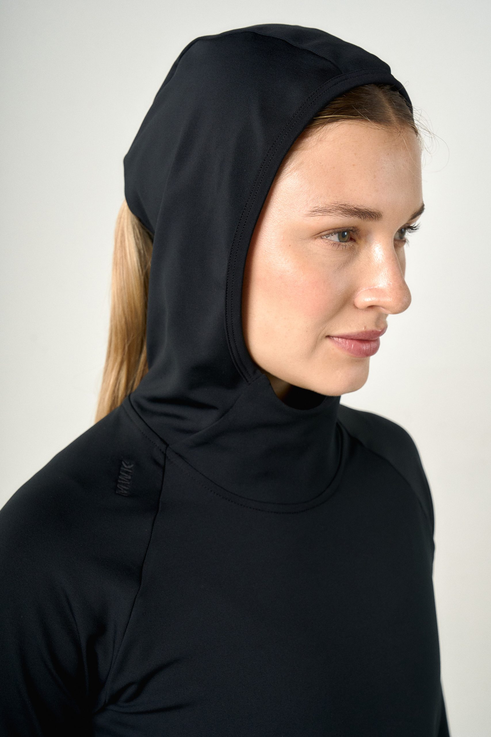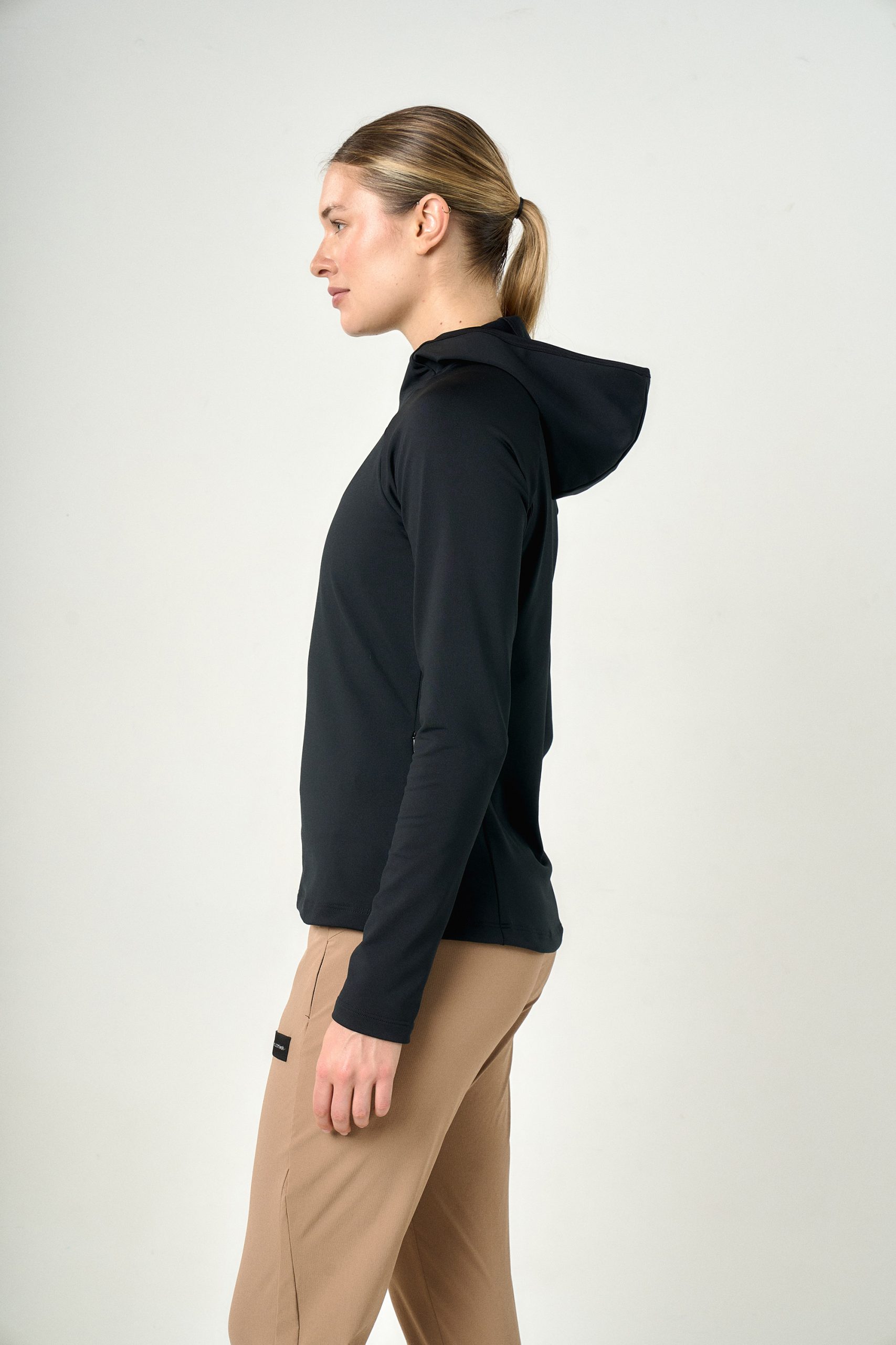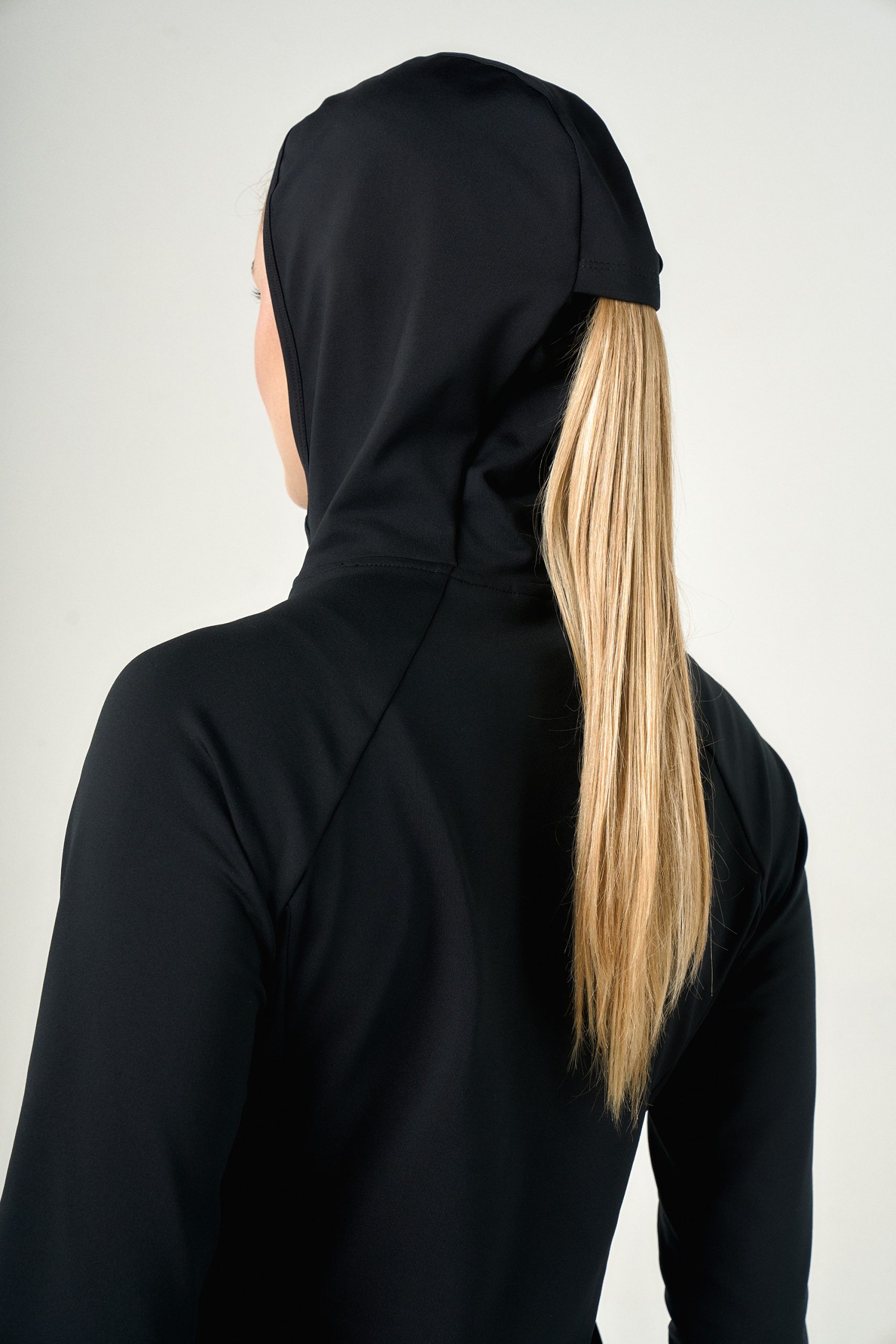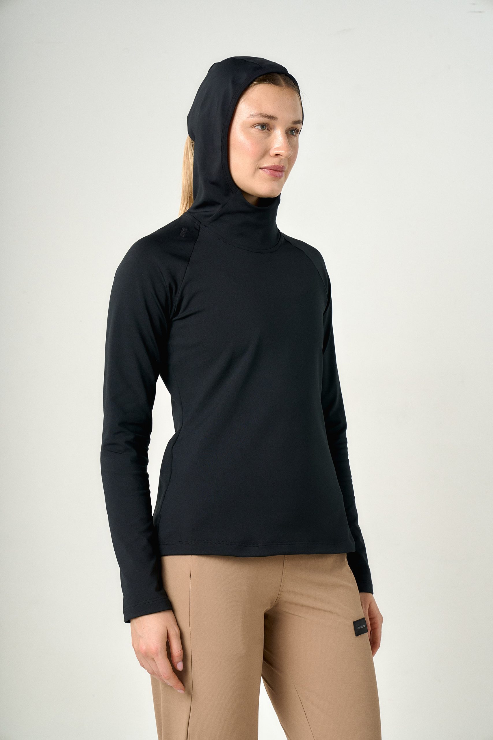 Buzo térmico en microfibra frisada y elástica; con capucha y manga larga. Cuenta con una abertura en el centro de capucha que funciona como pasador para el pelo, bolsillo con cierre invisible trasero para asegurar su funcionalidad en los días más fríos.