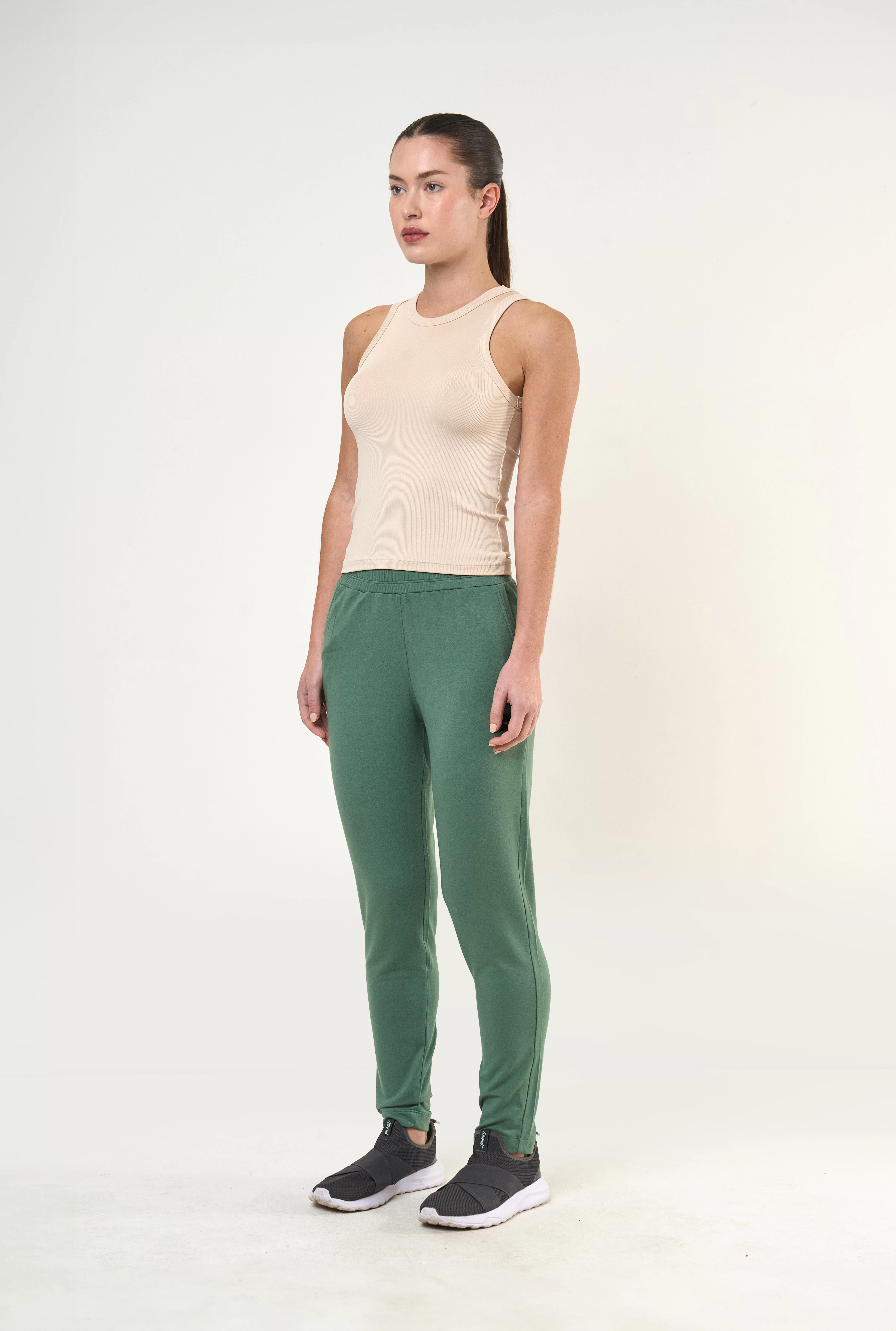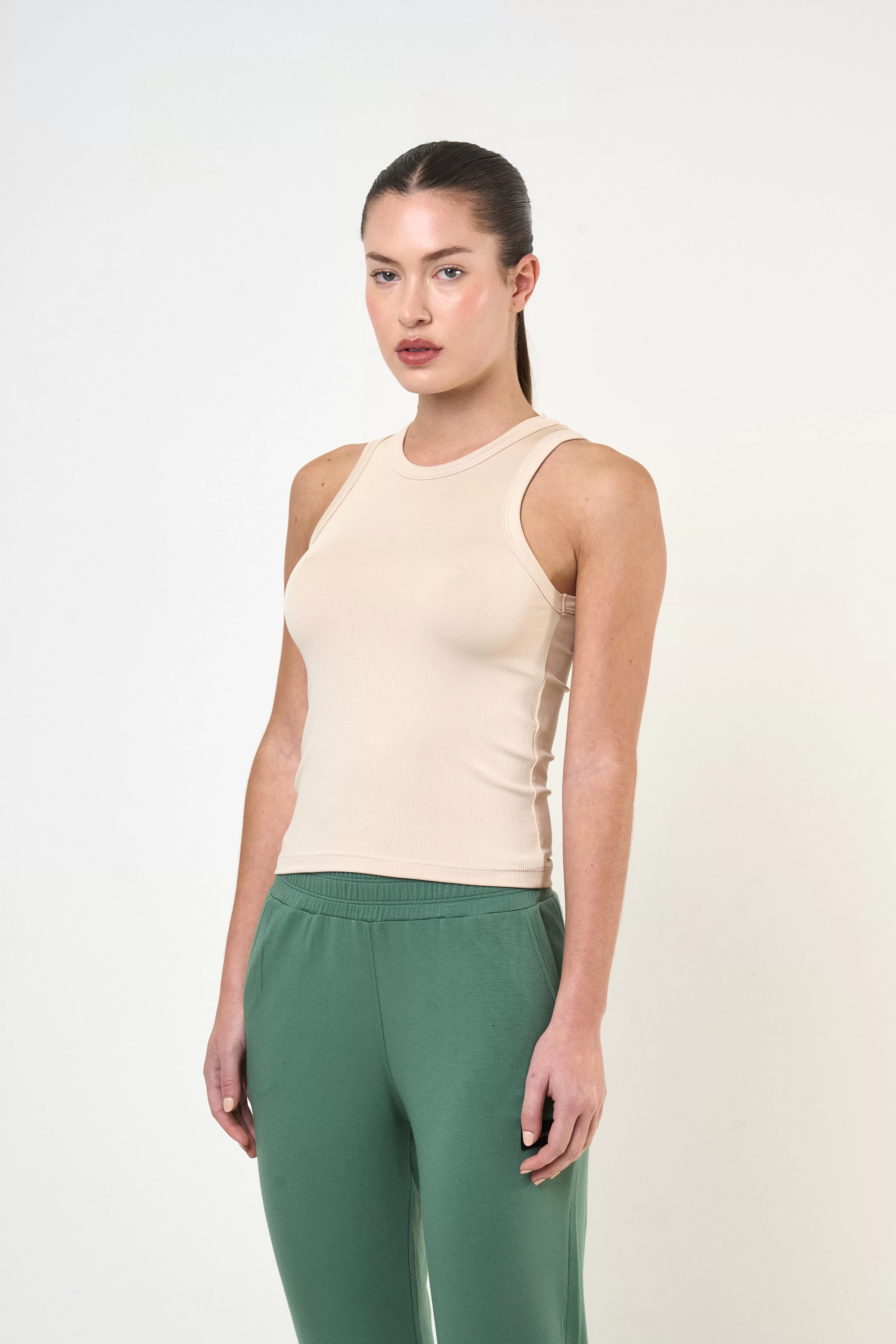 Musculosa de silueta entallada, confeccionada en textil premium de microfibra con spandex. Presenta una opción ligera y suave que ofrece el confort necesario para el uso urbano.