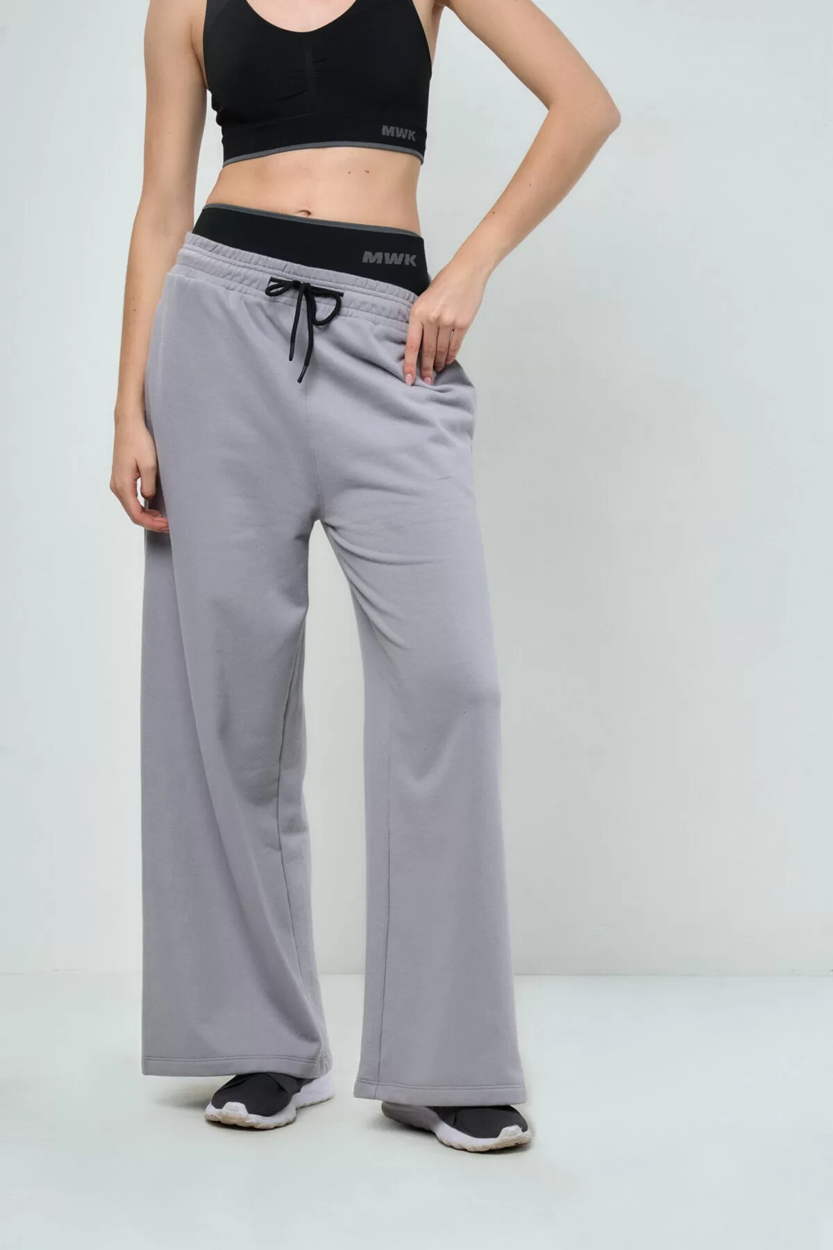 Pantalón jogger estilo palazzo en friza de algodón poliéster con bolsillos ocultos en los laterales y cintura alta añadida ajustable. Con detalle bordado ESTUDIO MIWOK sobre el delantero izquierdo. Un pantalón actual perfecto para uso diario o aventuras urbanas, manteniendo tu estilo en cualquier ocasión.