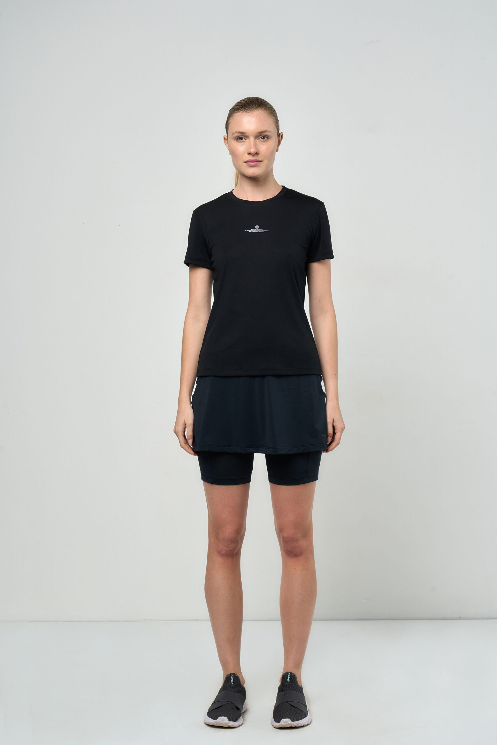 Pollera clásica en microfibra liviana modeladora y confortable, contiene un short interno con bolsillo para estar segura y cómoda mientras te moves libremente, ideal para deporte de mediano y alto impacto. Detalle bordado sutil de marca.