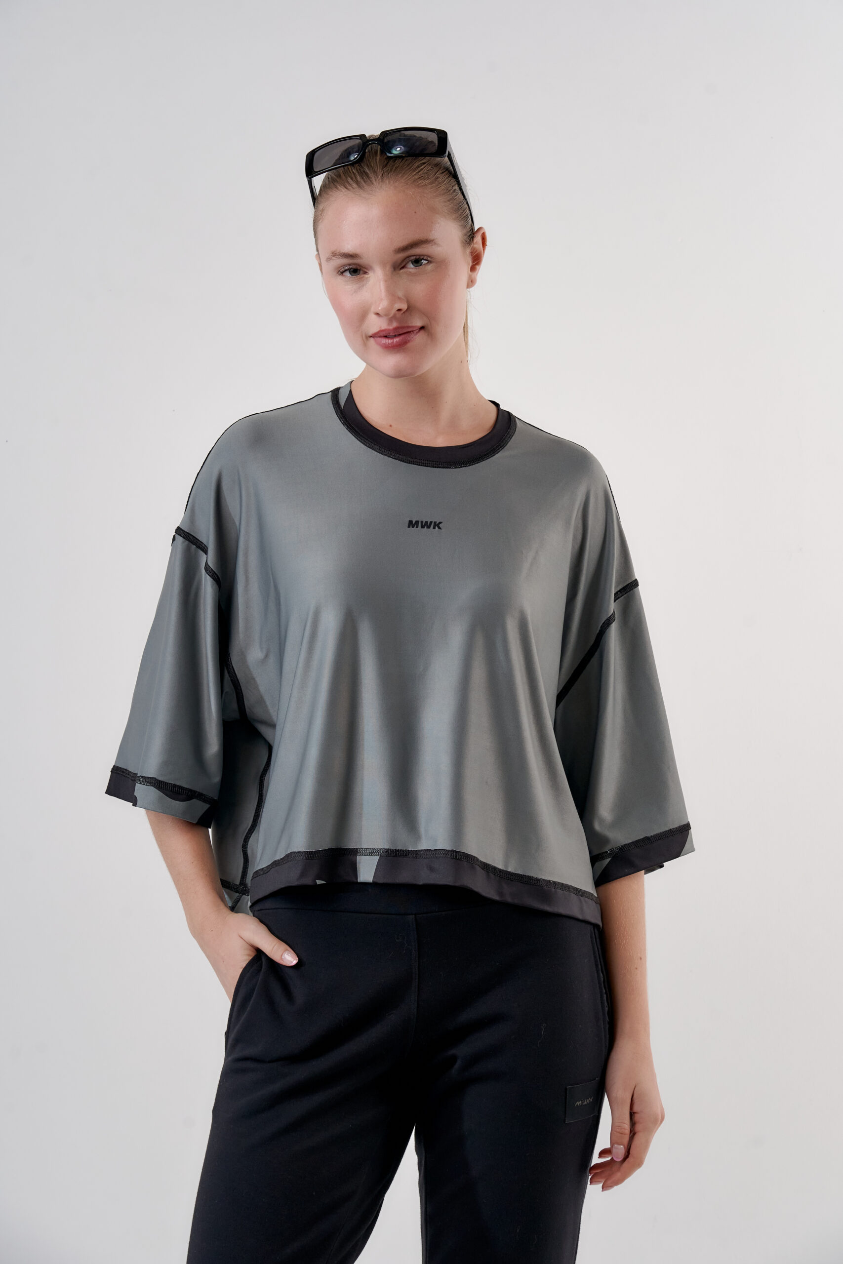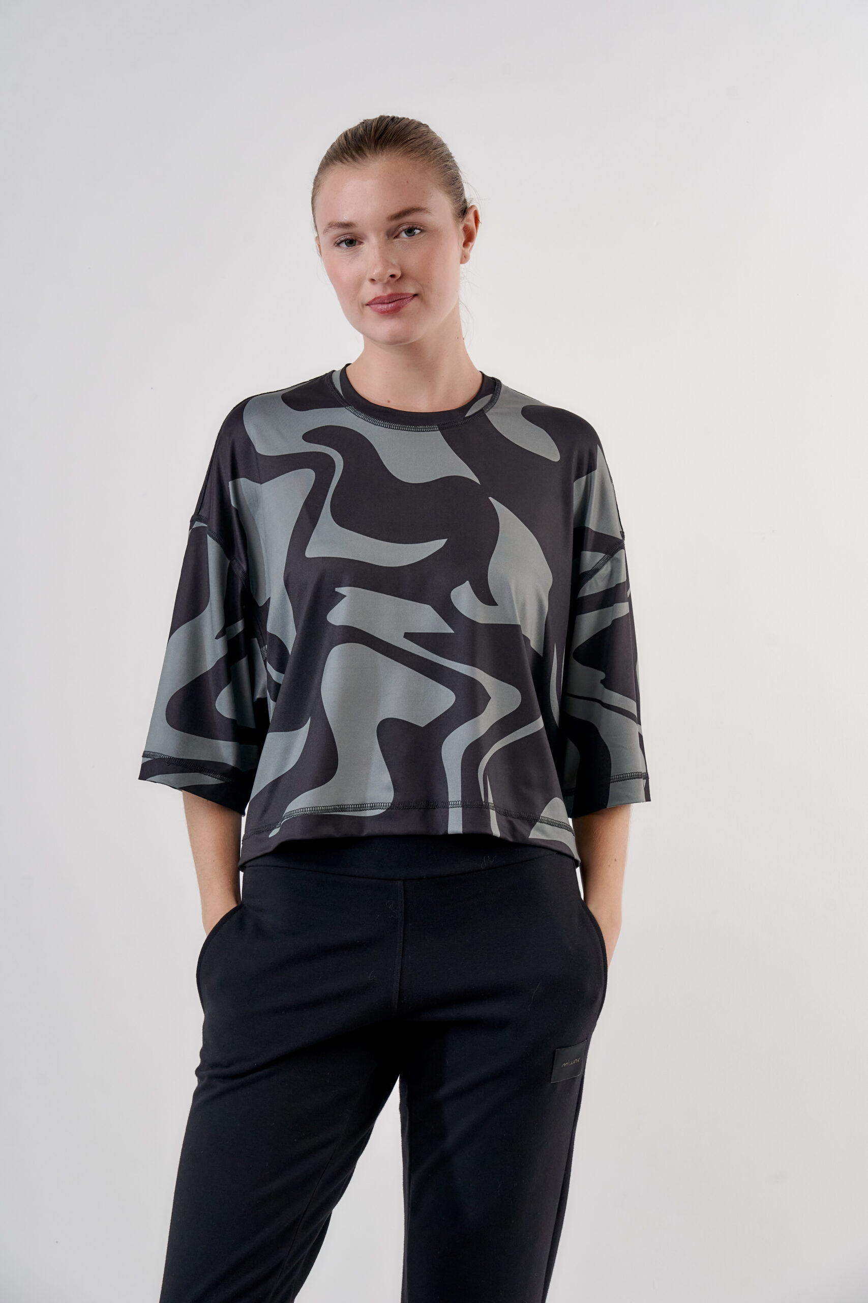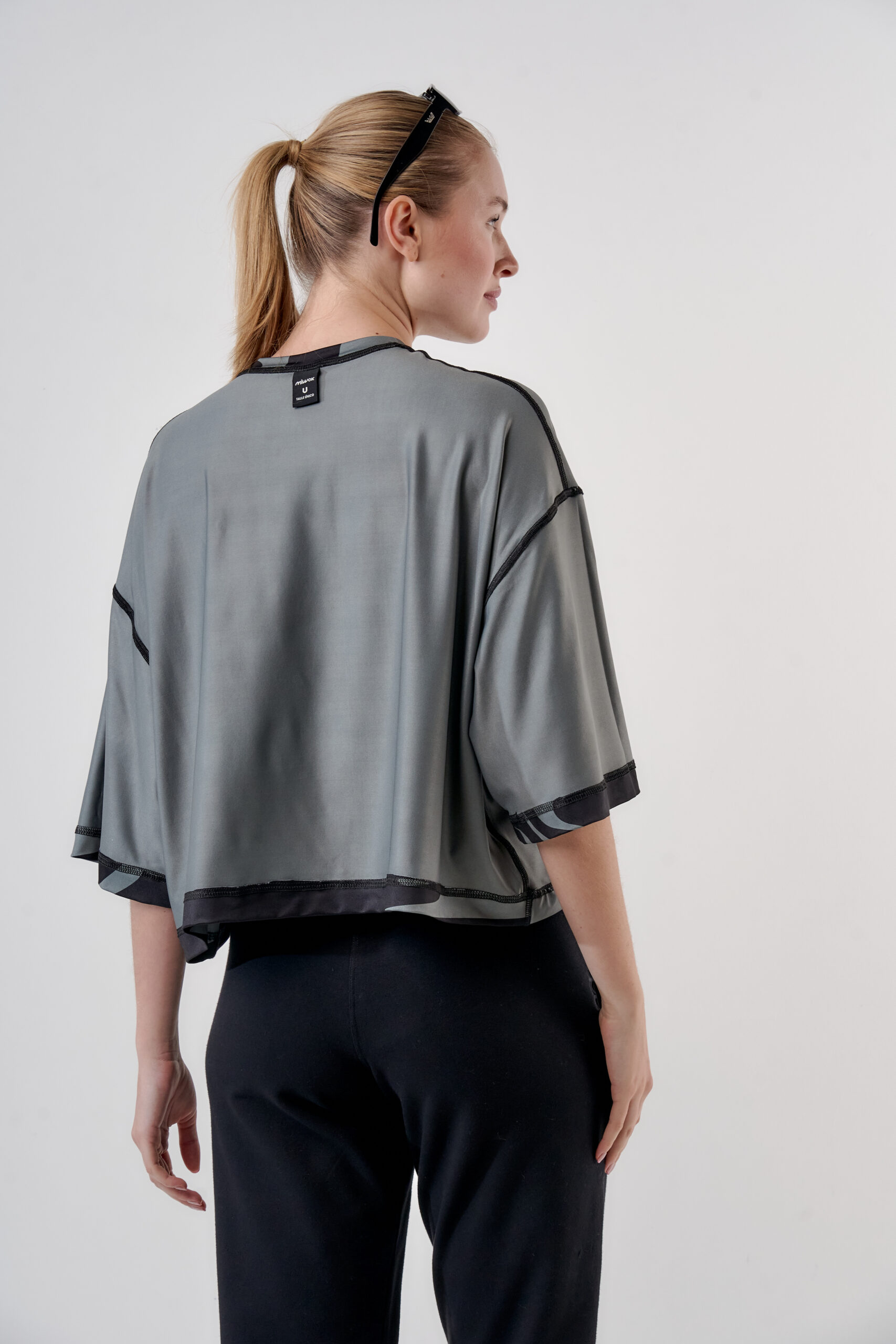 Remera crop holgada ultraliviana reversible FULL PRINT / LISO. Textil de microfibra liviana con spandex que se adapta al cuerpo para ofrecer un libre movimiento y un confort único.