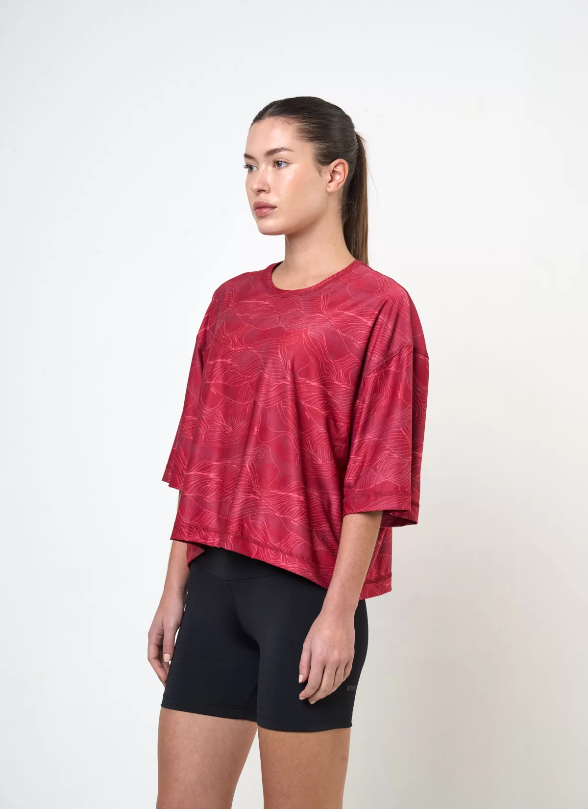 Remera de silueta boxy reversible, con hombro caído y escote redondo. Realizada en tejido estampado ultra soft con spandex, con estampa a tono en el derecho y degradé sobre el revés.