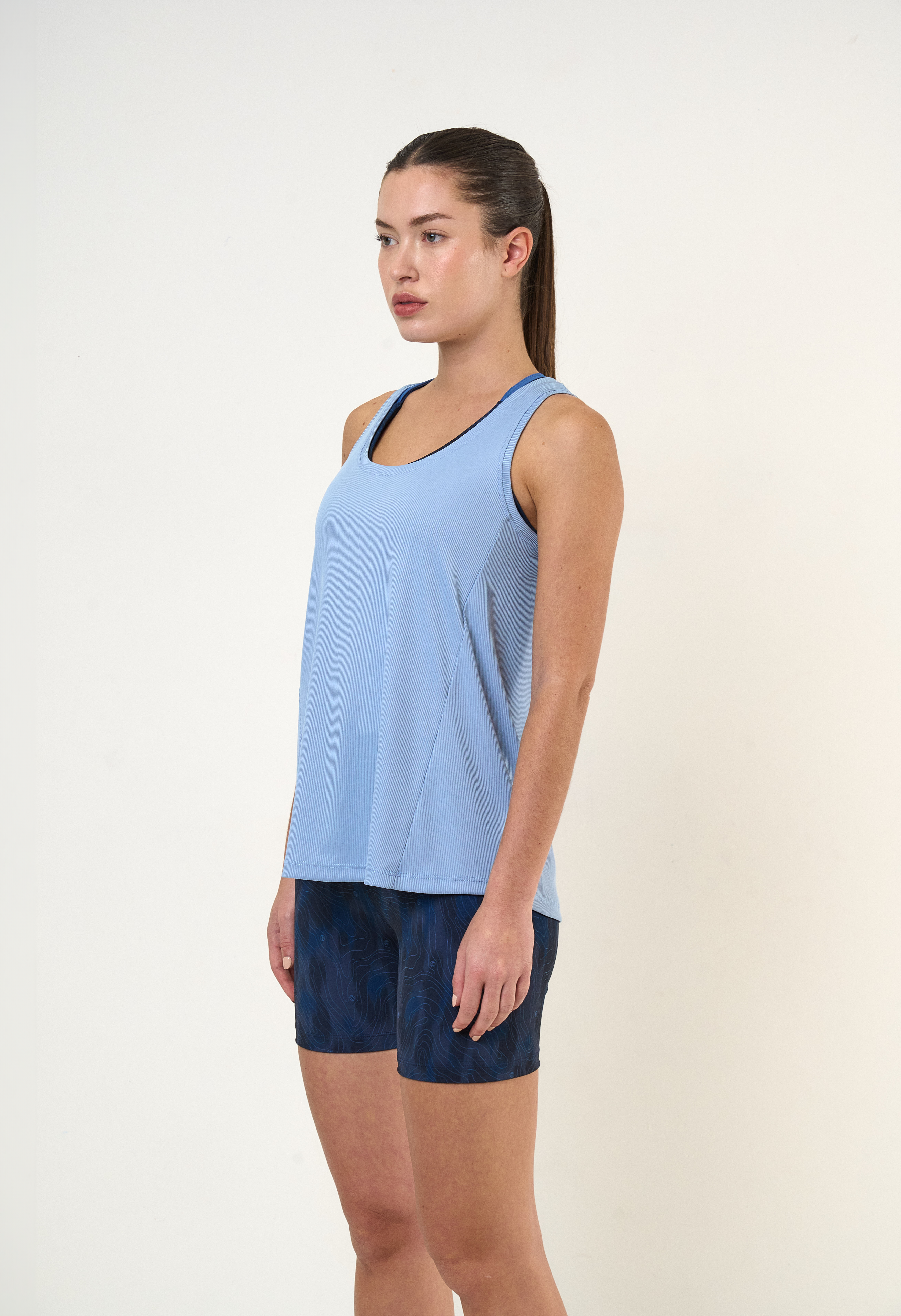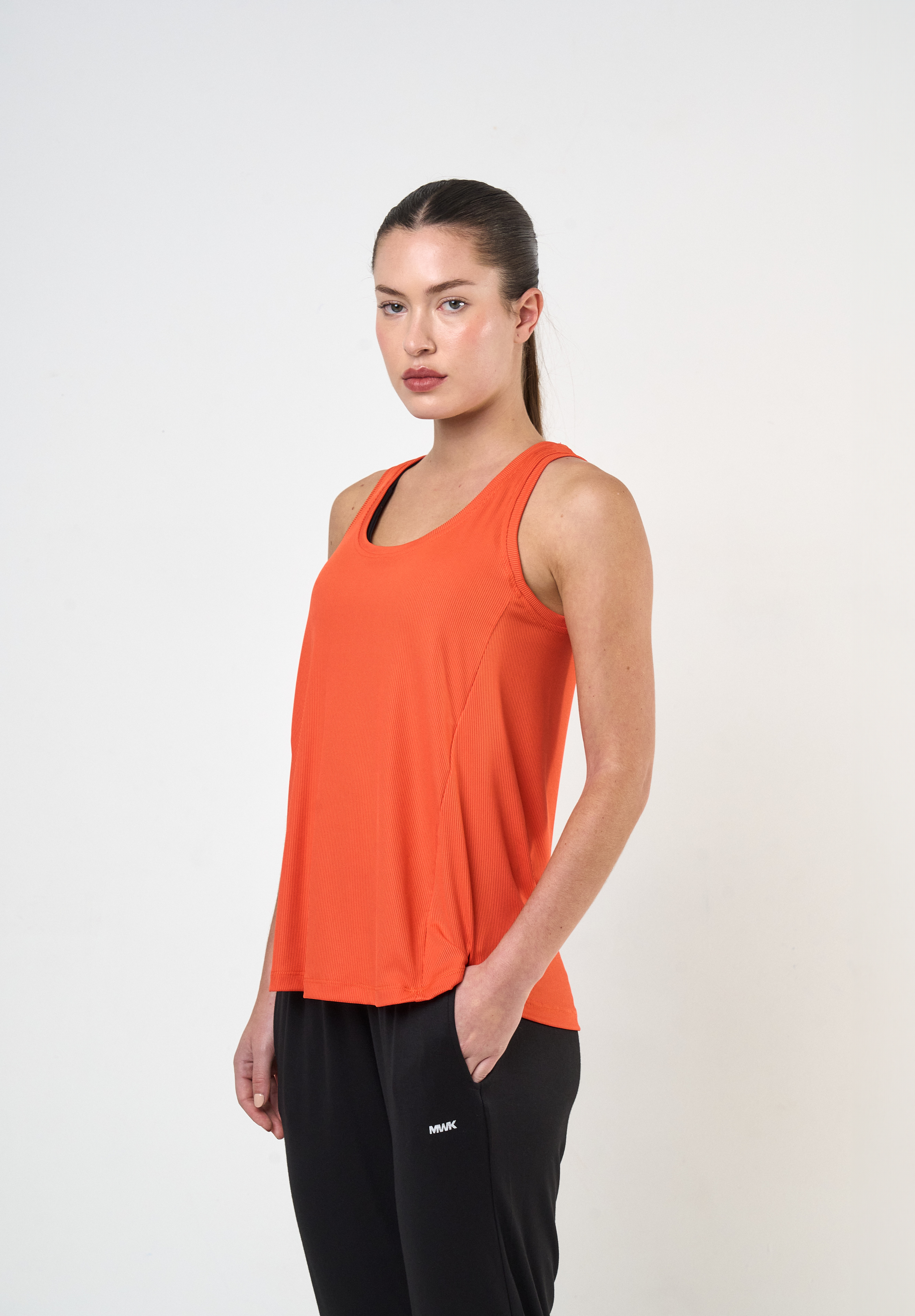 Musculosa de calce holgado y silueta evasé, presenta escote redondo. Confeccionada en textil premium de microfibra con spandex. 92% Poliéster 8% Elastano