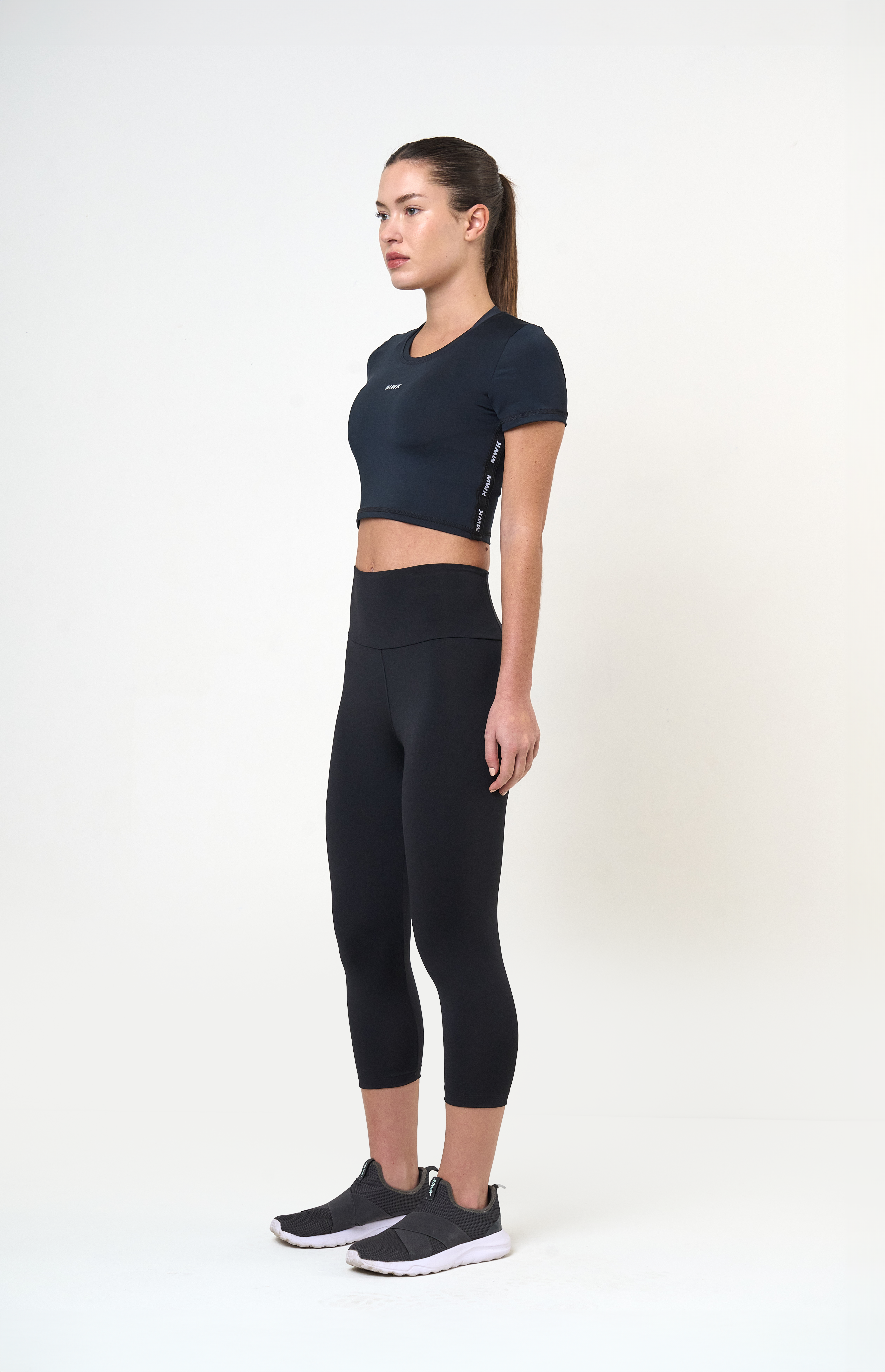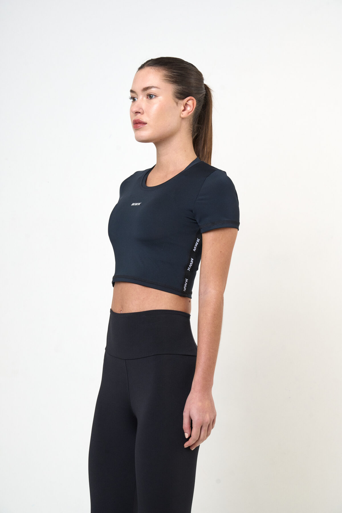 Remera crop anatómica ultraliviana. Tejido ultra soft con spandex que se adapta al cuerpo para ofrecer un libre movimiento. Textil de rápido secado y buena transpirabilidad. Con detalles de vinilo reflex MWK en frente y elástico en espalda y lateral.