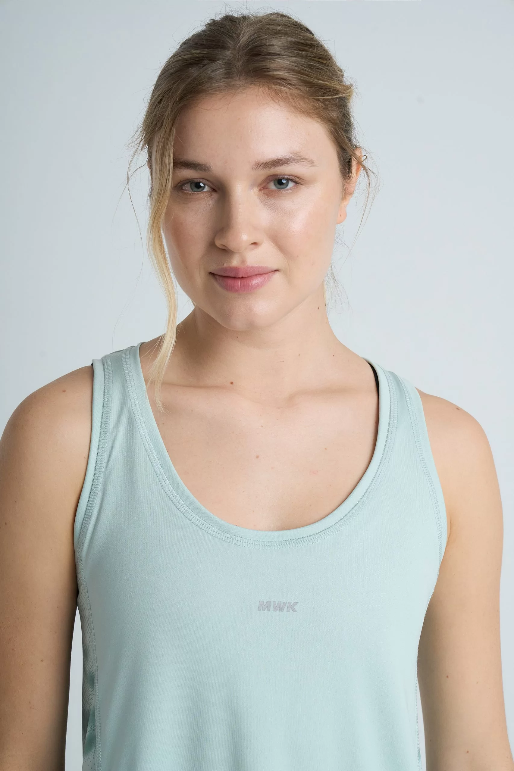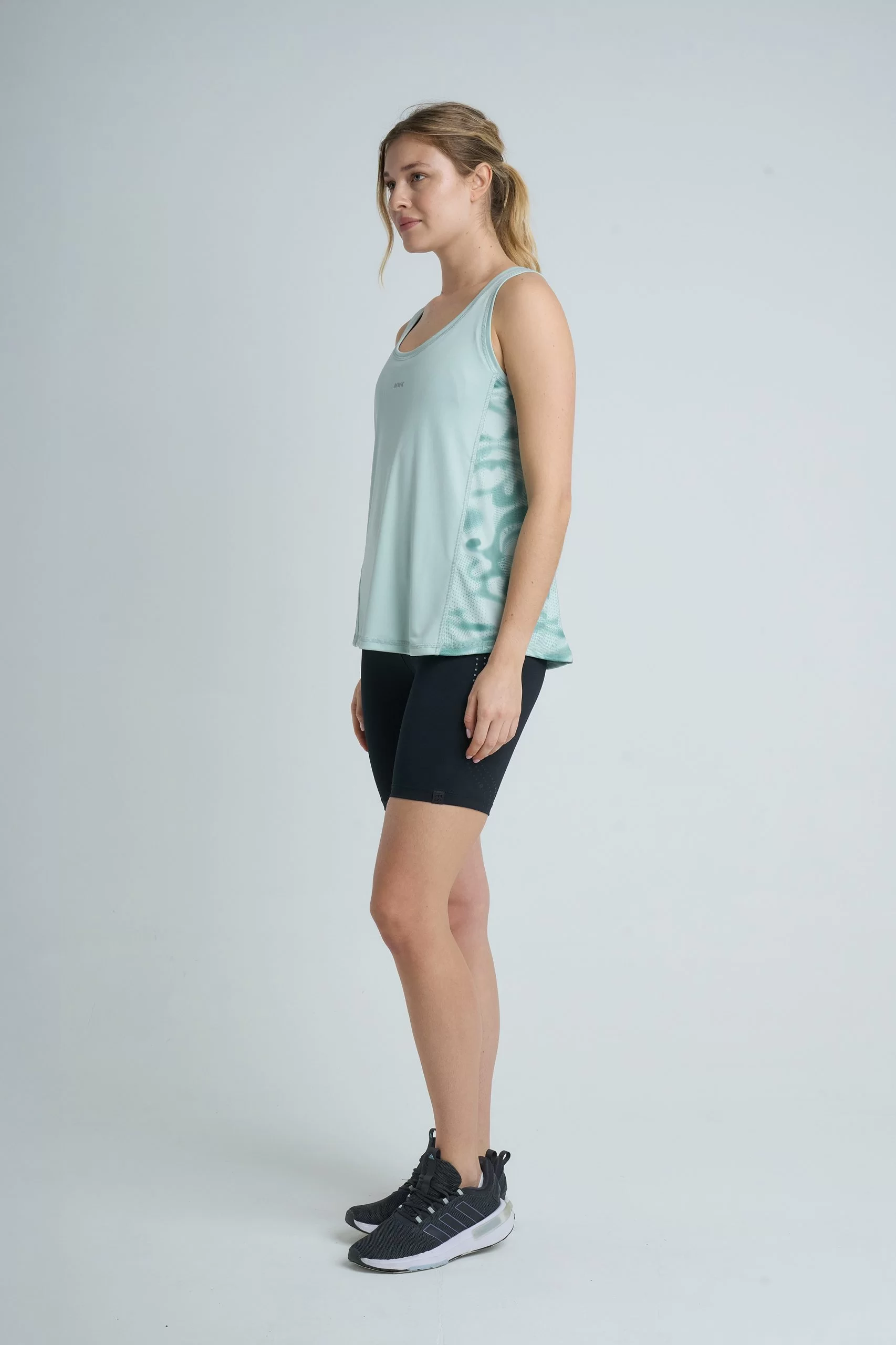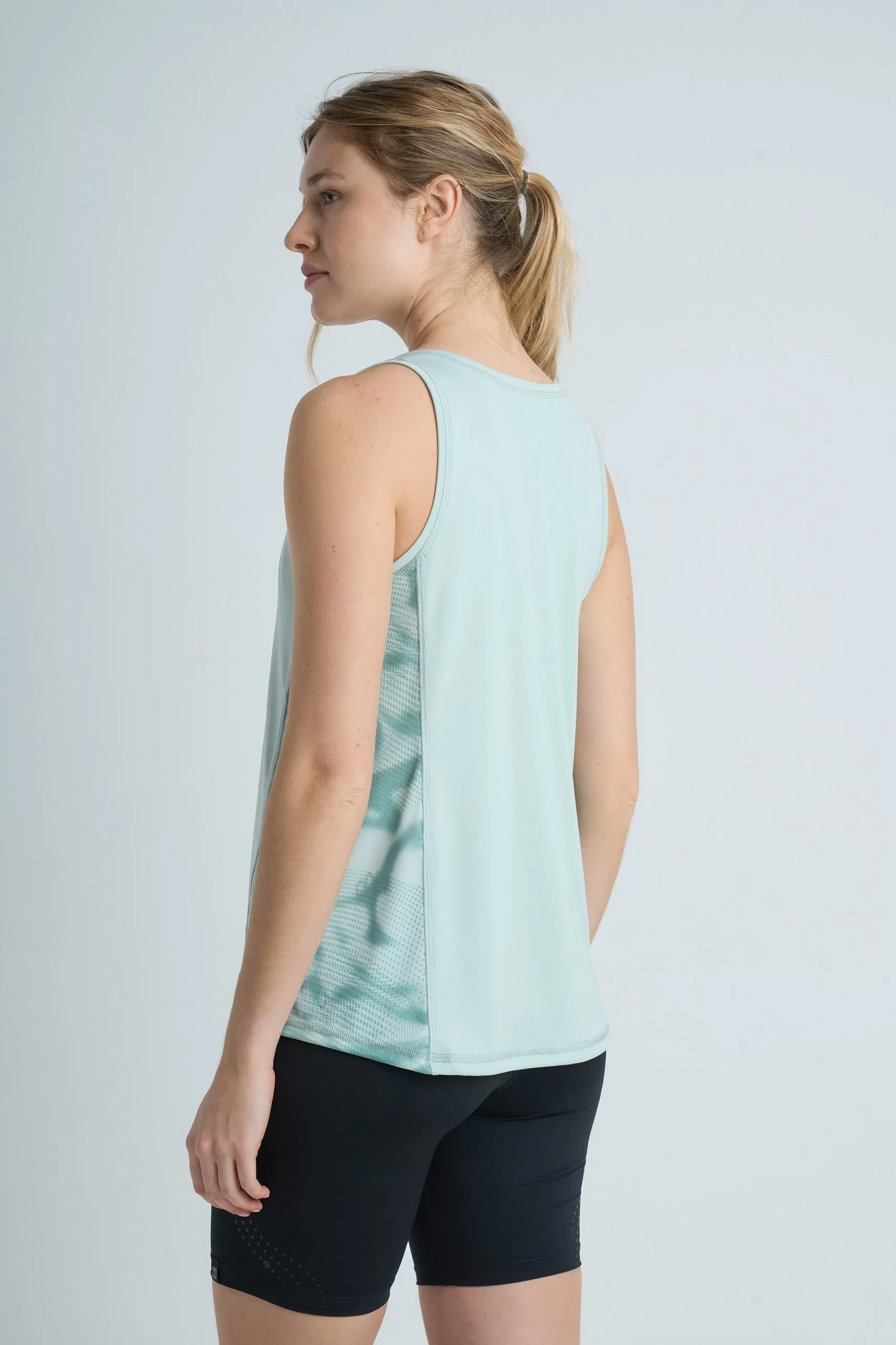 Musculosa amplia de silueta evasé con recortes estampados y detalles en bordador, confeccionada en textil microset microfibra Diseño deportivo clásico y funcional para la actividad física.
