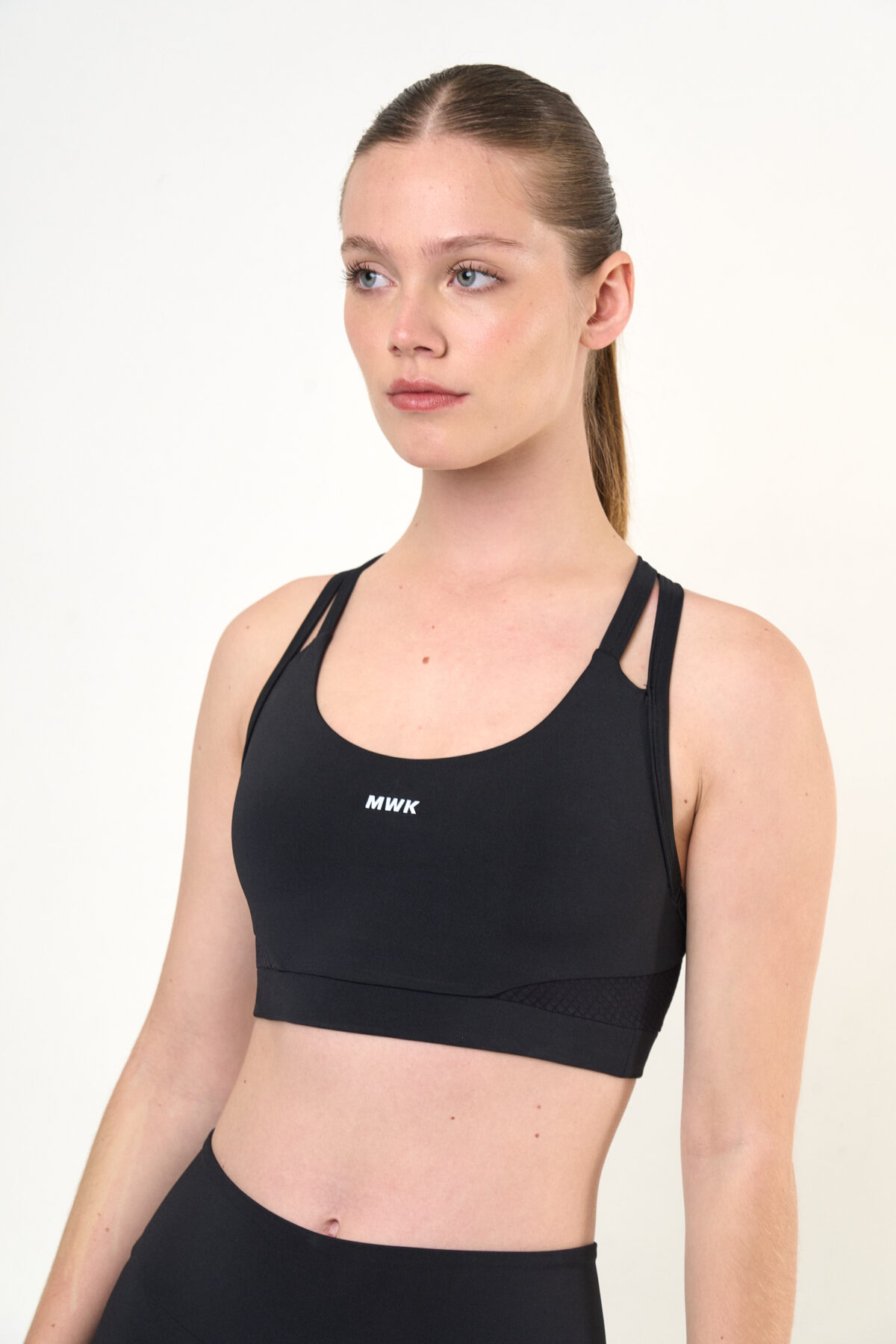 Top deportivo de escote bajo, con detalle de breteles finos y espalda con textil diferencial, que aporta respirabilidad, diseñado para deportes de bajo a medio impacto. Confeccionado en
