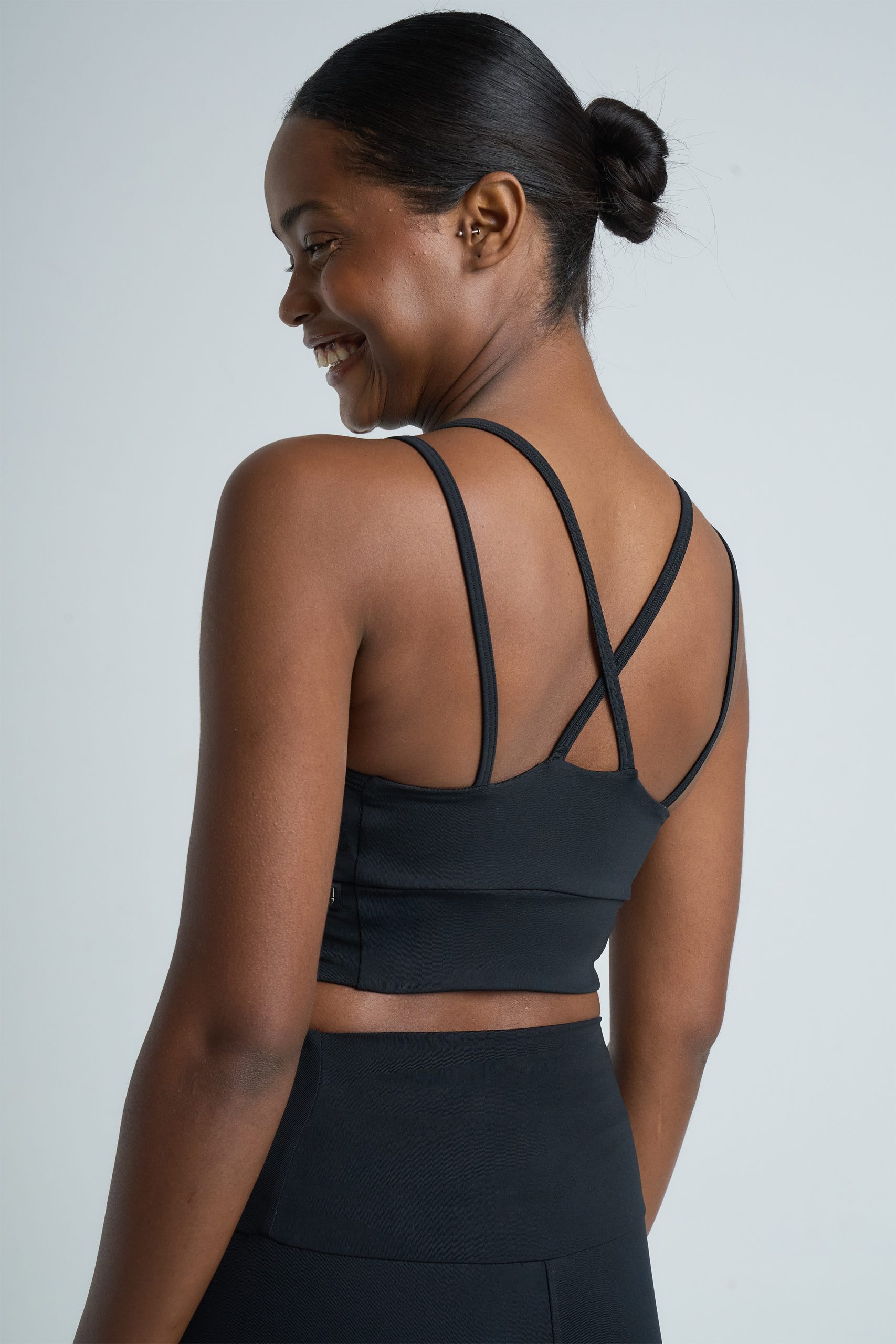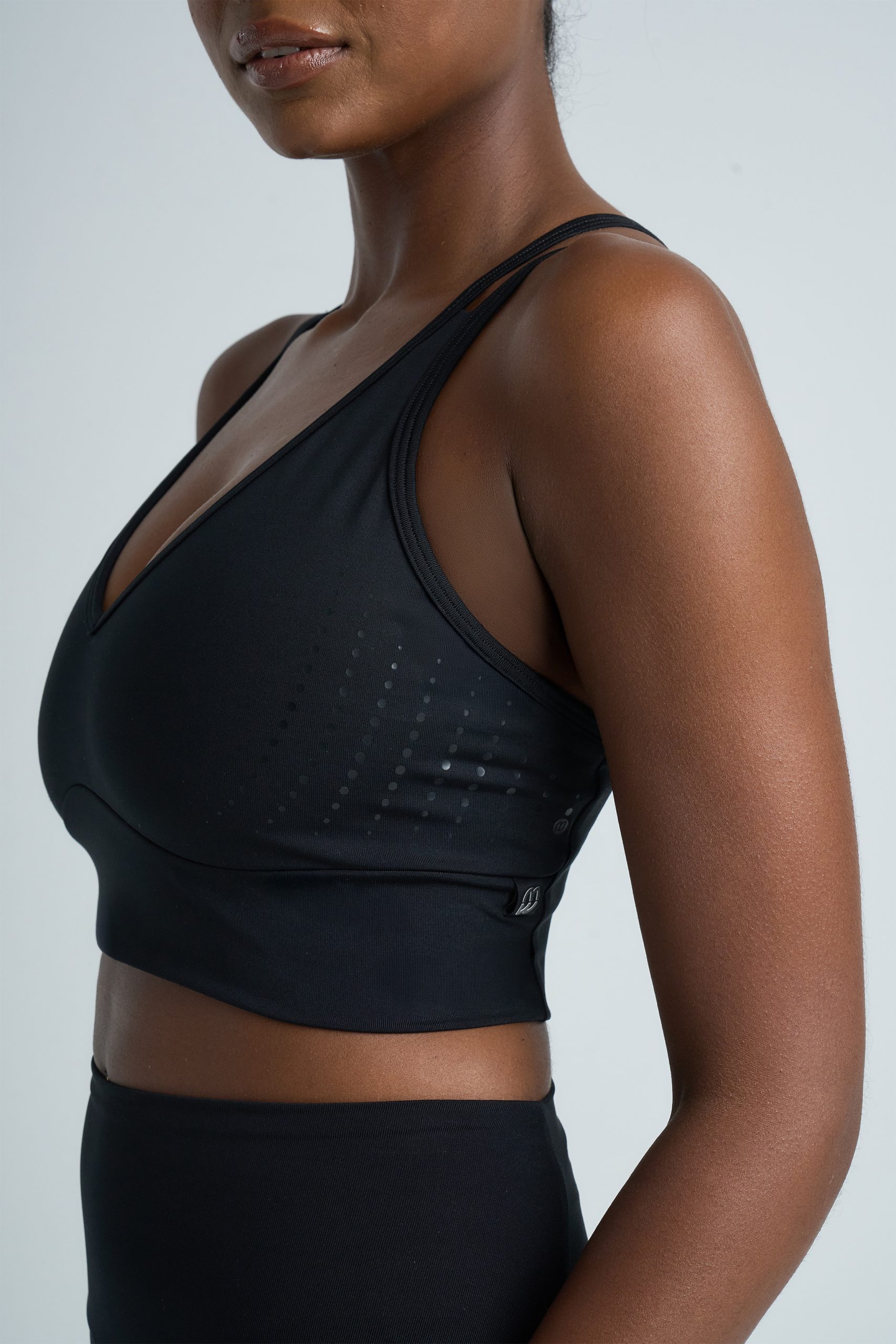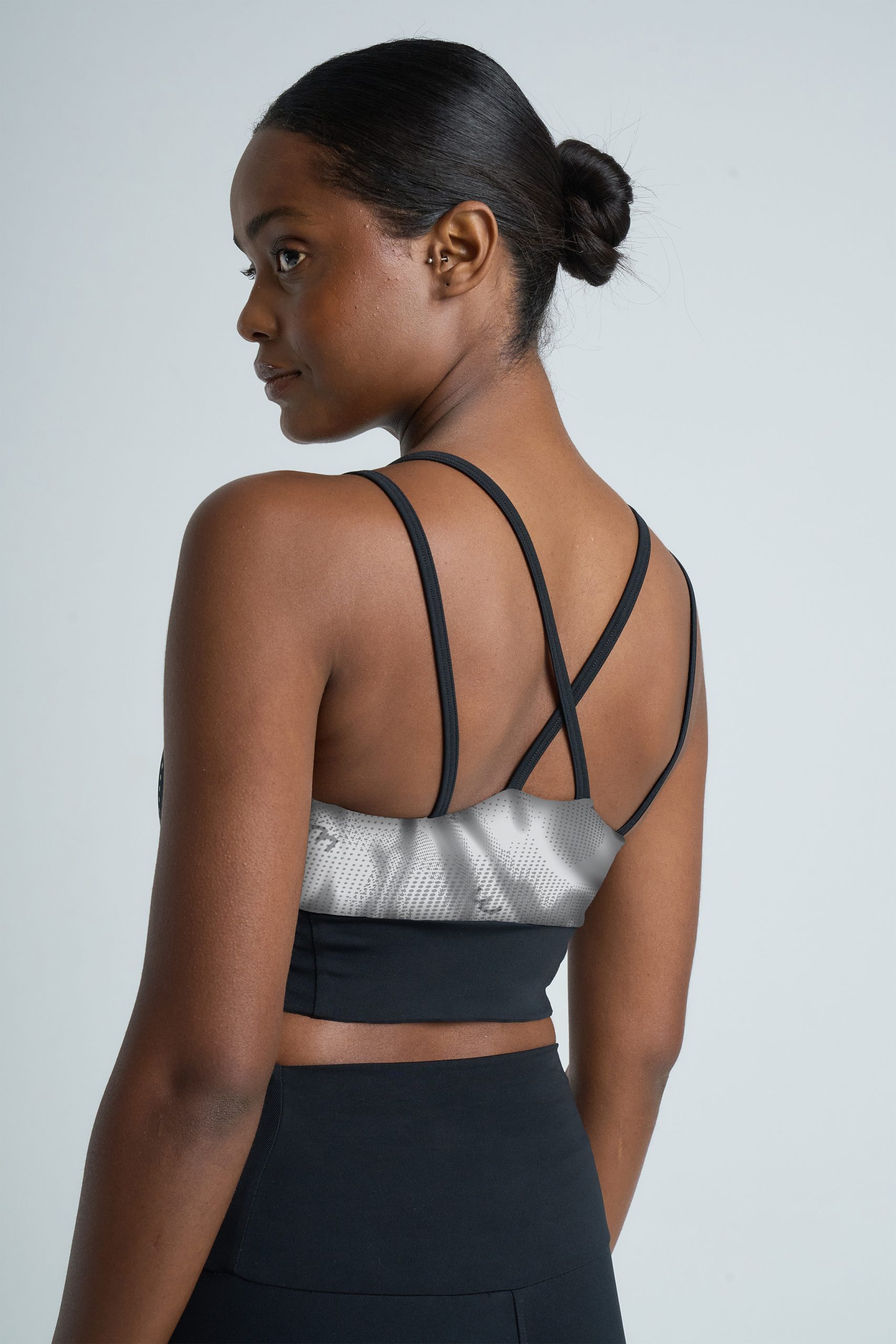 Top 2 en 1, reversible con forreria sublimada. Confeccionado en textil Microfibra ultra opaca con detalle de estampa localizada. Con escote en V y entalle perfecto, diseñado para resaltar la figura, posee cintura con forma y bordador para aplanar costuras. Brinda sujeción alta para el deporte de medio y alto impacto.