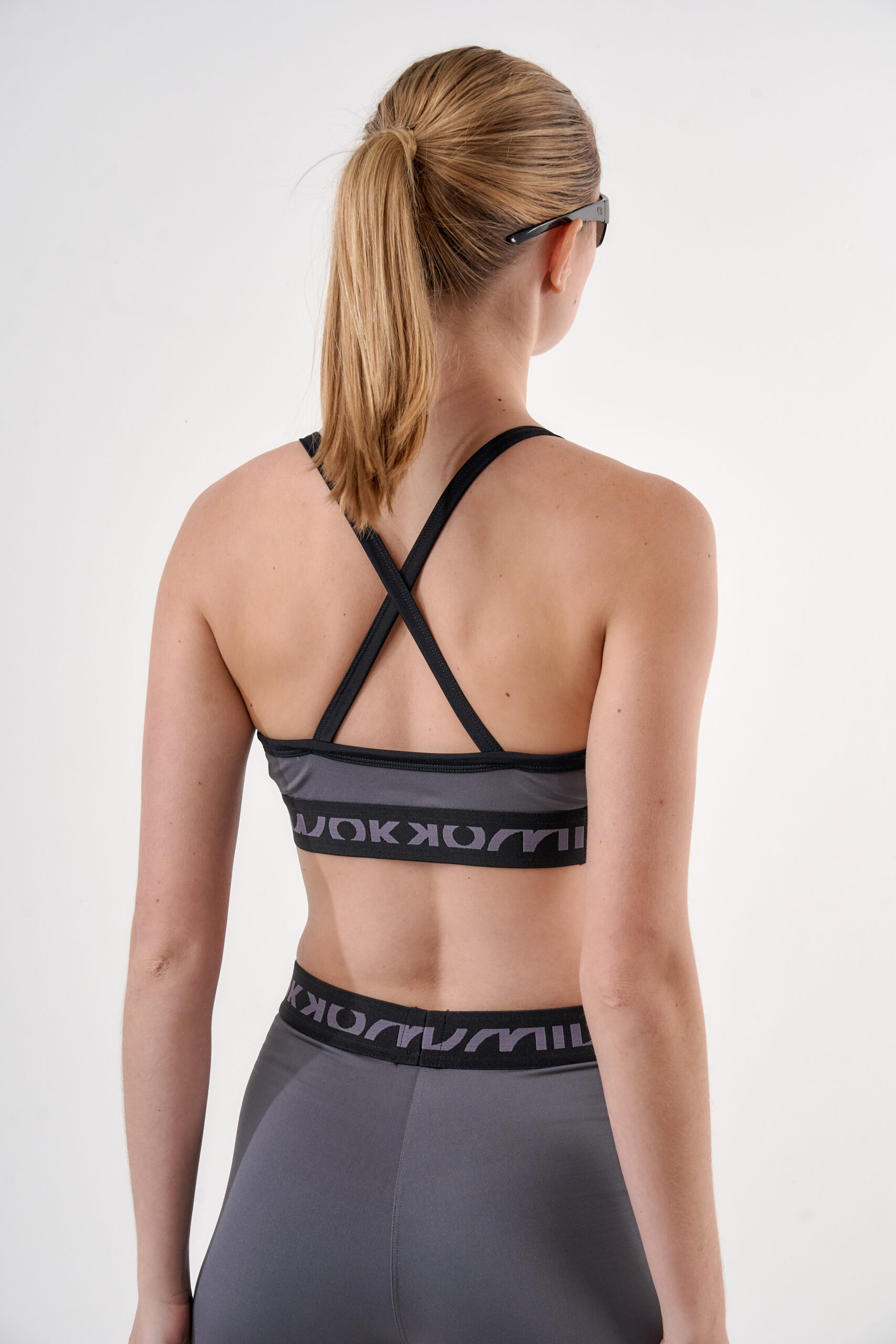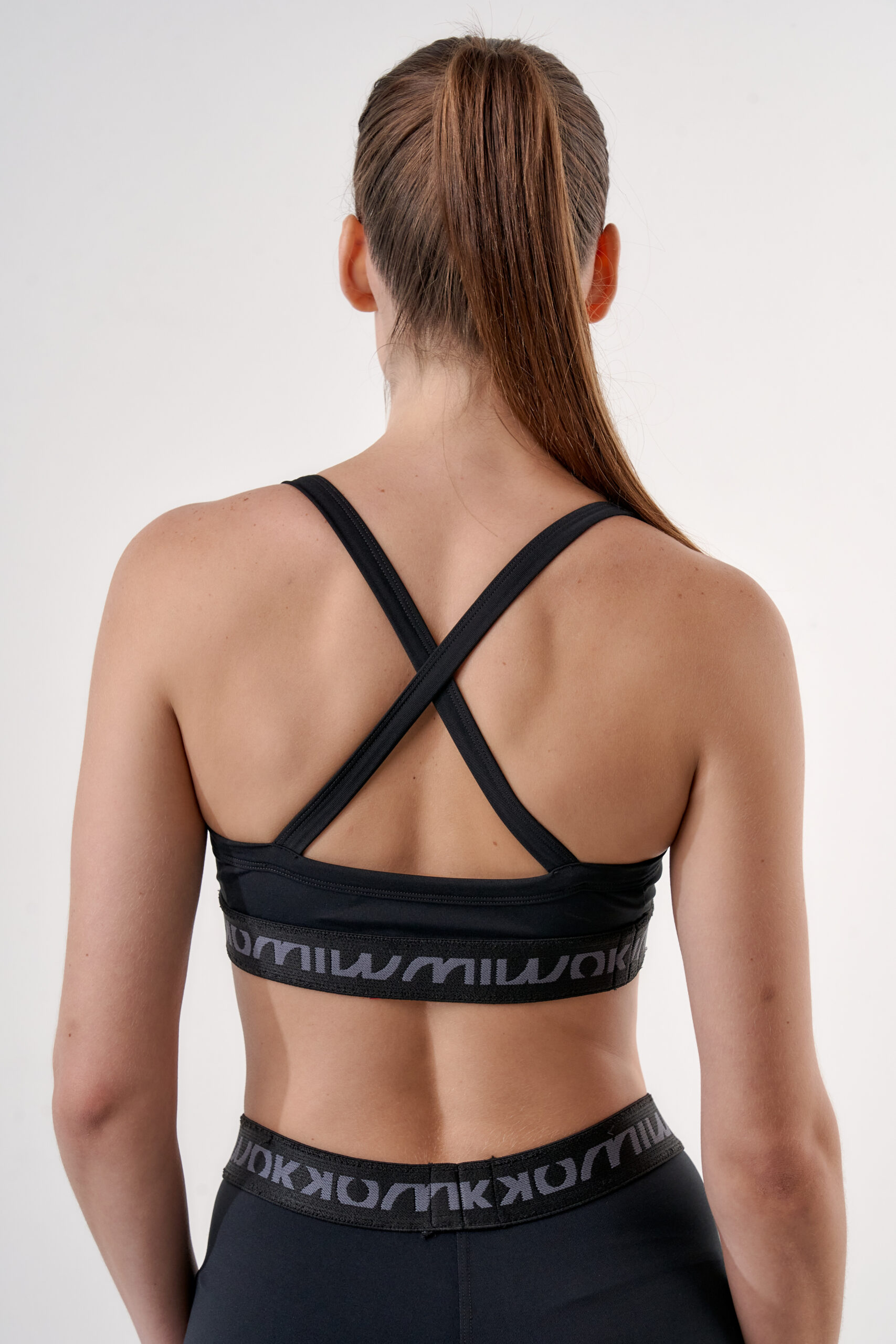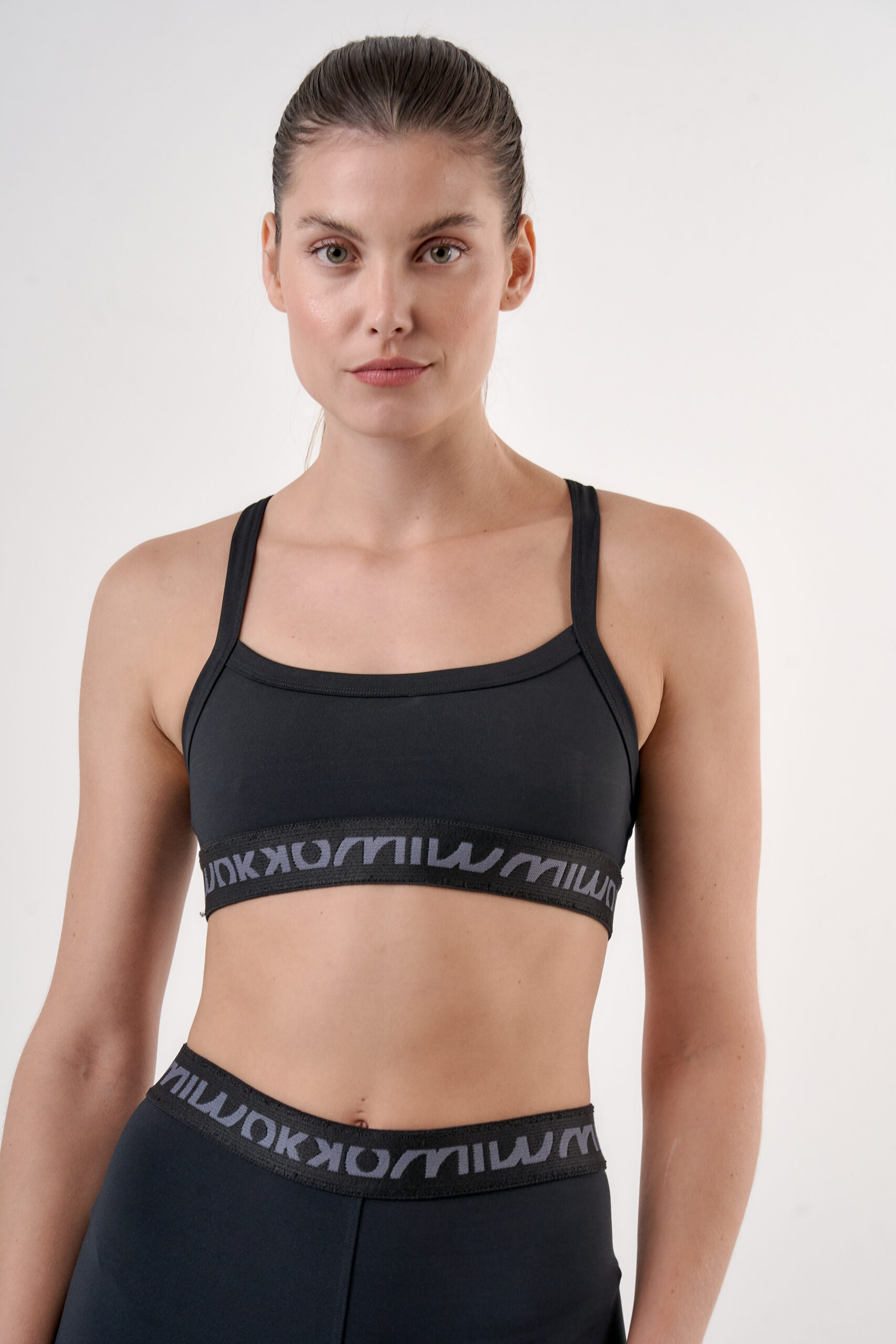 Top deportivo de escote bajo, con breteles y elastico exclusivo MWK. Textil microfibra con lycra que se adapta a diferentes cuerpos y permite mantener el cuerpo seco y un rango de movimiento natural. Detalle de elástico exclusivo de Miwok que con tejidos ligeros y suaves que ofrecen el confort necesario para actividades de bajo impacto.