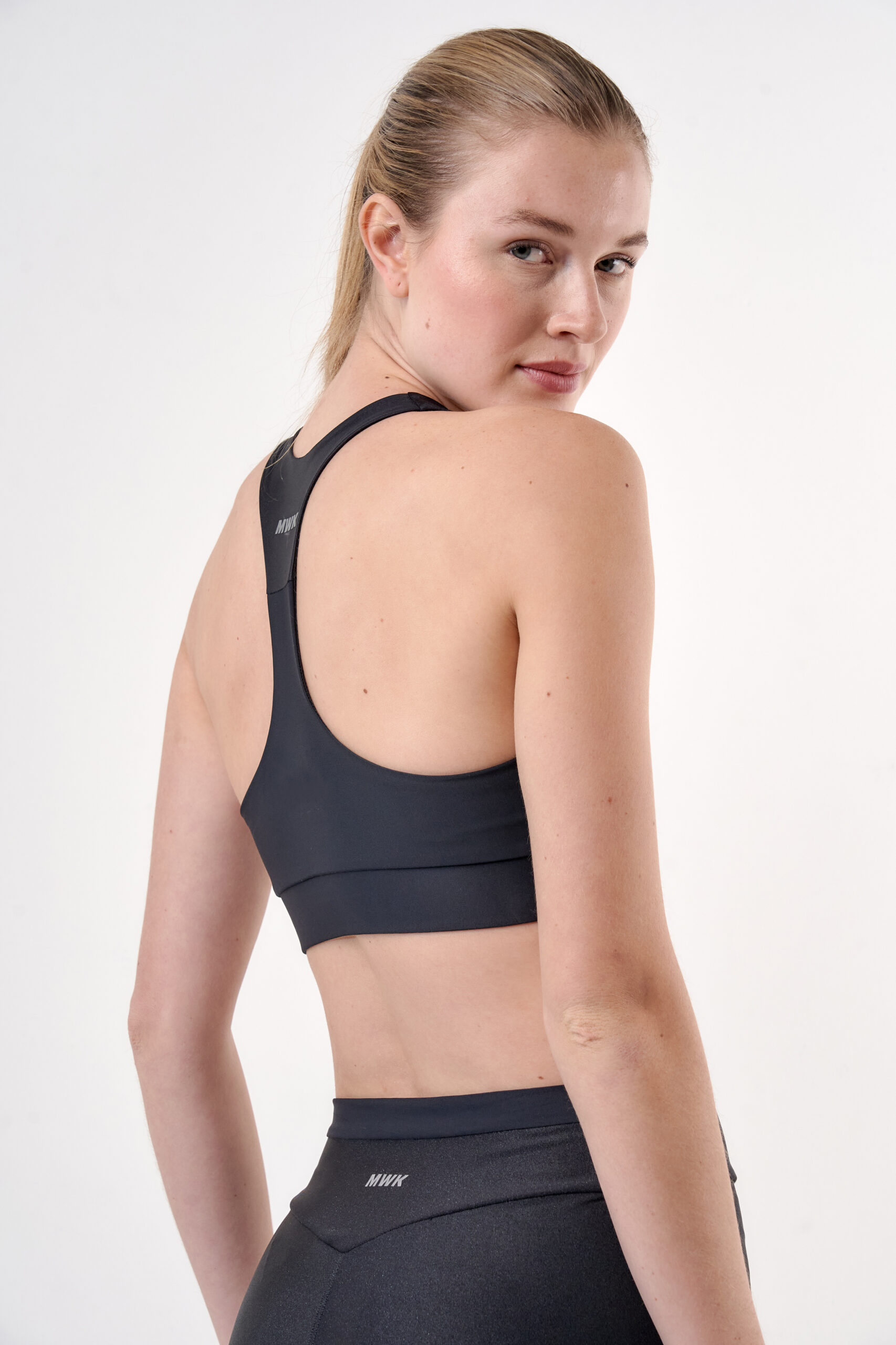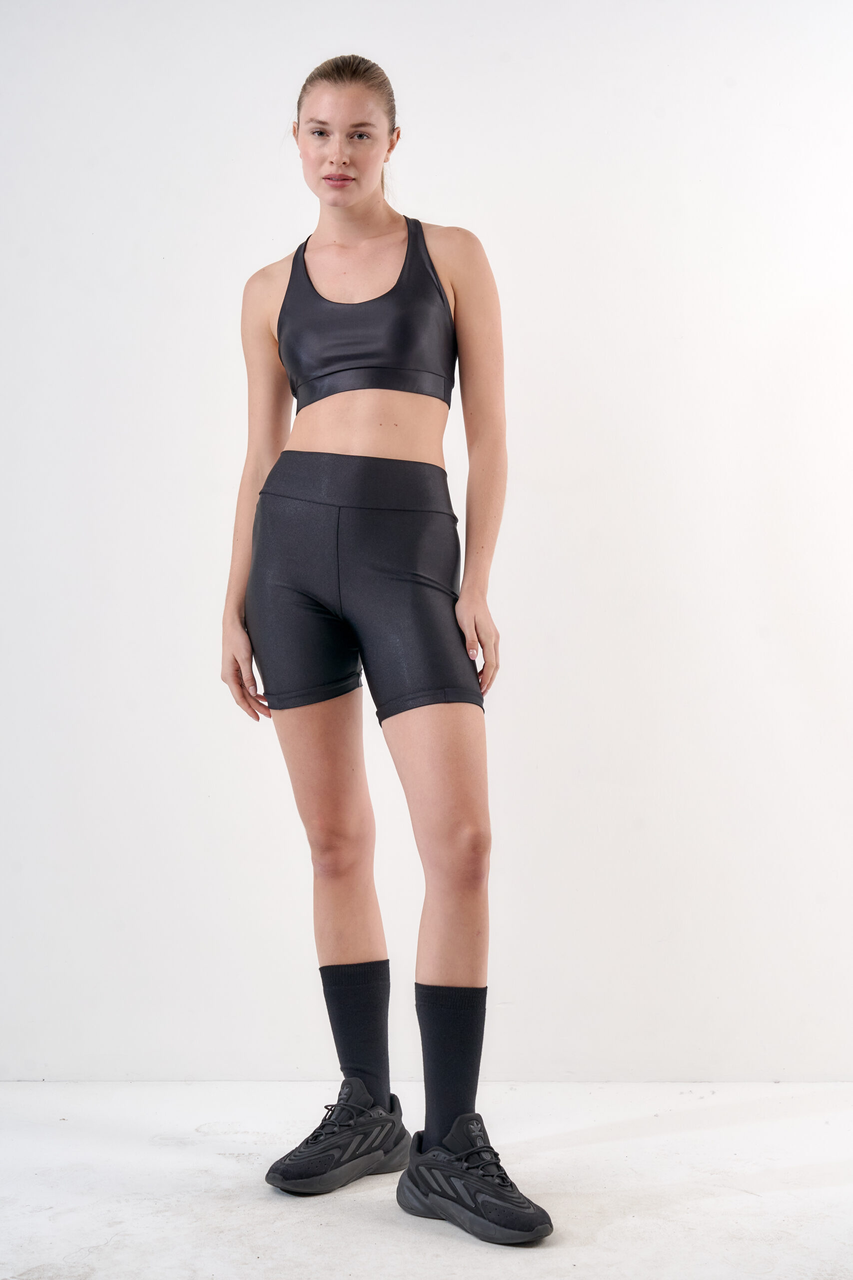 Top deportivo con espalda estilo ciclista en combinación. Confeccionado en microfibra con lycra brillosa, extremadamente suave y ligero, se adapta a diferentes cuerpos y permite mantener el cuerpo seco y un rango de movimiento natural.